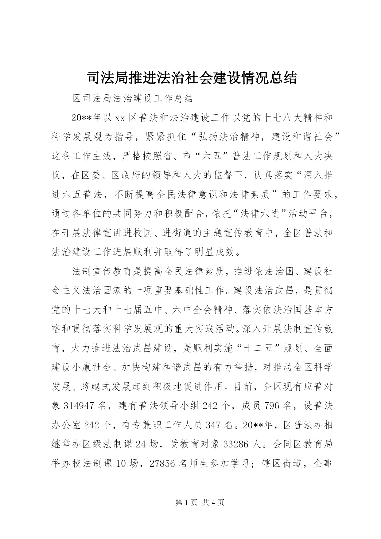 第PAGE\*Arabic\*MERGEFORMAT4页共NUMPAGES\*MERGEFORMAT4页司法局推进法治社会建设情况总结区司法局法治建设工作总结20**年以xx区普法和法治建设工作以党的十七八大精神和科学发展观为指导,紧紧抓住“弘扬法治精神,建设和谐社会”这条工作主线,严格按照省、市“六五”普法工作规划和人大决议,在区委、区政府的领导和人大的监督下,认真落实“深入推进六五普法,不断提高全民法律意识和法律素质”的工作要求,通过各单位的共同努力和积极配合,依托“法律六进”活动平台,在