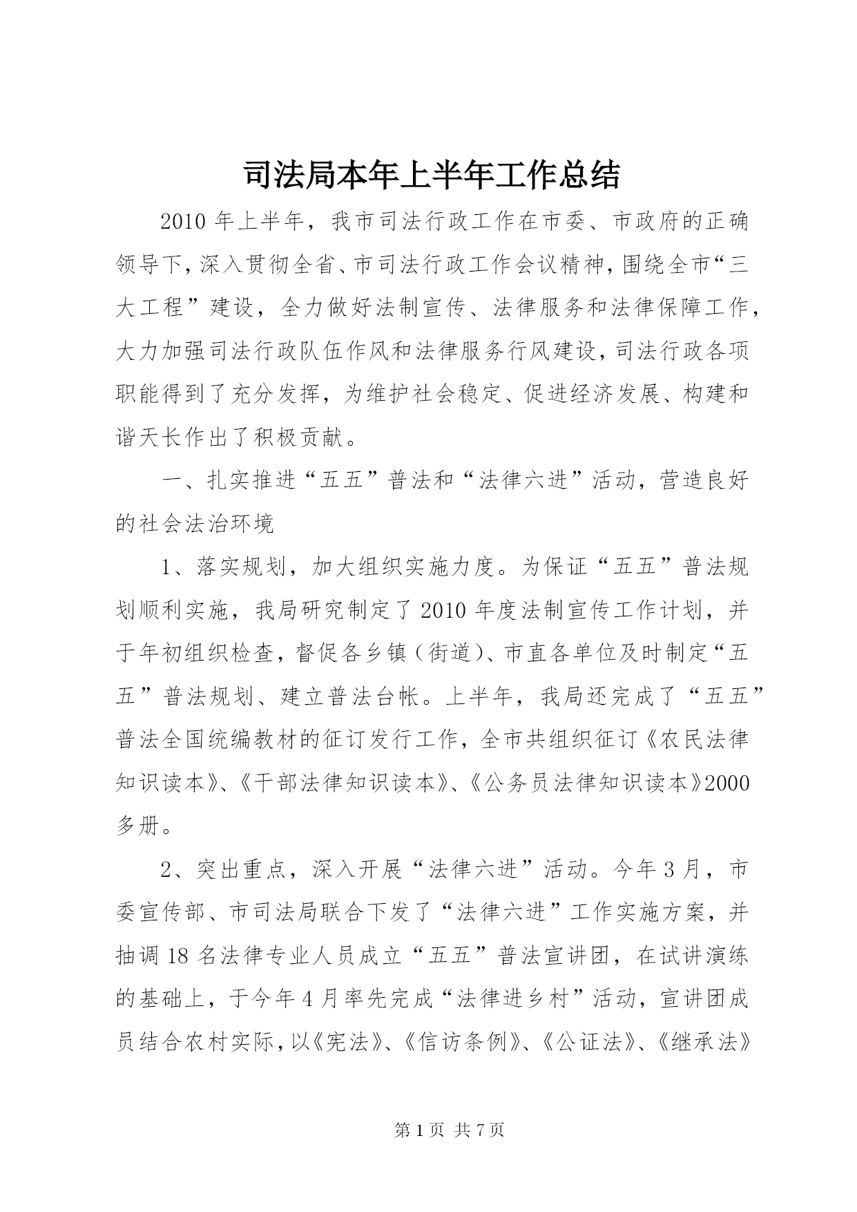 第PAGE\*Arabic\*MERGEFORMAT7页共NUMPAGES\*MERGEFORMAT7页司法局本年上半年工作总结2010年上半年,我市司法行政工作在市委、市政府的正确领导下,深入贯彻全省、市司法行政工作会议精神,围绕全市“三大工程”建设,全力做好法制宣传、法律服务和法律保障工作,大力加强司法行政队伍作风和法律服务行风建设,司法行政各项职能得到了充分发挥,为维护社会稳定、促进经济发展、构建和谐天长作出了积极贡献。一、扎实推进“五五”普法和“法律六进”活动,营造良好的社会法治环境1