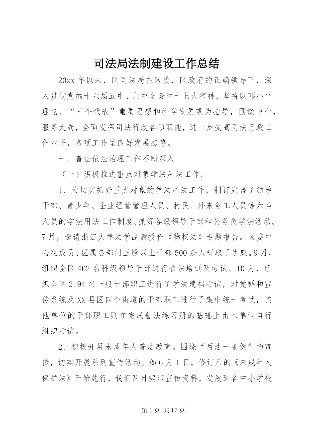 第PAGE\*Arabic\*MERGEFORMAT17页共NUMPAGES\*MERGEFORMAT17页司法局法制建设工作总结20xx年以来,区司法局在区委、区政府的正确领导下,深入贯彻党的十六届五中、六中全会和十七大精神,坚持以邓小平理论、“三个代表”重要思想和科学发展观为指导,围绕中心,服务大局,全面发挥司法行政各项职能,进一步提高司法行政工作水平,各项工作呈良好发展态势。一、普法依法治理工作不断深入(一)积极推进重点对象学法用法工作。1、为切实抓好重点对象的学法用法工作,制订完善了领