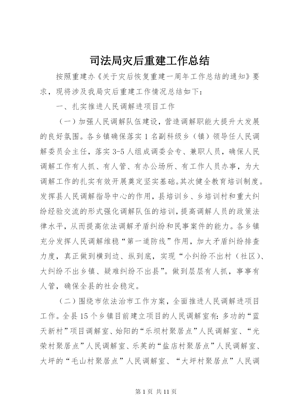 第PAGE\*Arabic\*MERGEFORMAT11页共NUMPAGES\*MERGEFORMAT11页司法局灾后重建工作总结按照重建办《关于灾后恢复重建一周年工作总结的通知》要求,现将涉及我局灾后重建工作情况总结如下:一、扎实推进人民调解进项目工作(一)加强人民调解队伍建设,营造调解职能大提升大发展的良好氛围。各乡镇确保落实1名副科级乡(镇)领导任人民调解委员会主任,落实3-5人组成调委会专、兼职人员,确保人民调解工作有人抓、有人管、有办公场所、有工作人员办事,为大调解工作的扎实有效开展
