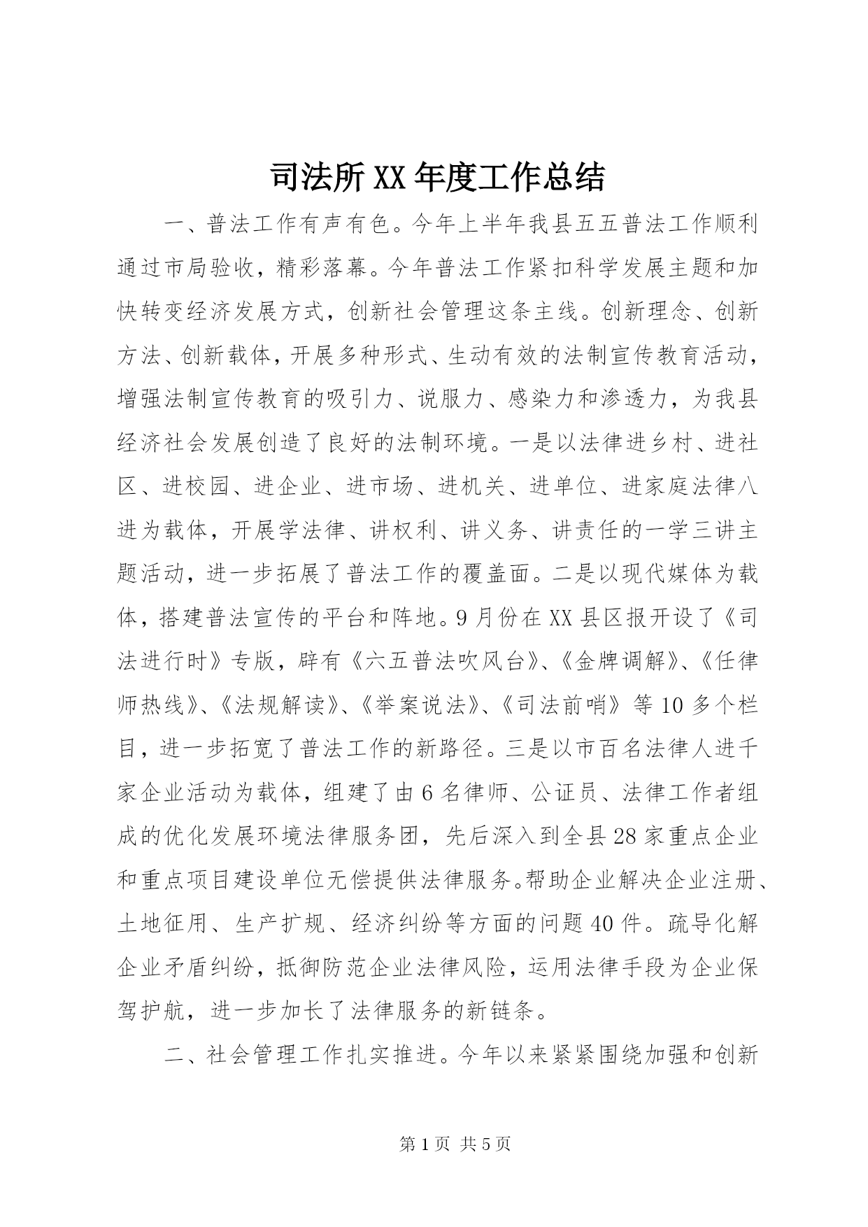 第PAGE\*Arabic\*MERGEFORMAT5页共NUMPAGES\*MERGEFORMAT5页司法所XX年度工作总结一、普法工作有声有色。今年上半年我县五五普法工作顺利通过市局验收,精彩落幕。今年普法工作紧扣科学发展主题和加快转变经济发展方式,创新社会管理这条主线。创新理念、创新方法、创新载体,开展多种形式、生动有效的法制宣传教育活动,增强法制宣传教育的吸引力、说服力、感染力和渗透力,为我县经济社会发展创造了良好的法制环境。一是以法律进乡村、进社区、进校园、进企业、进市场、进机关、进