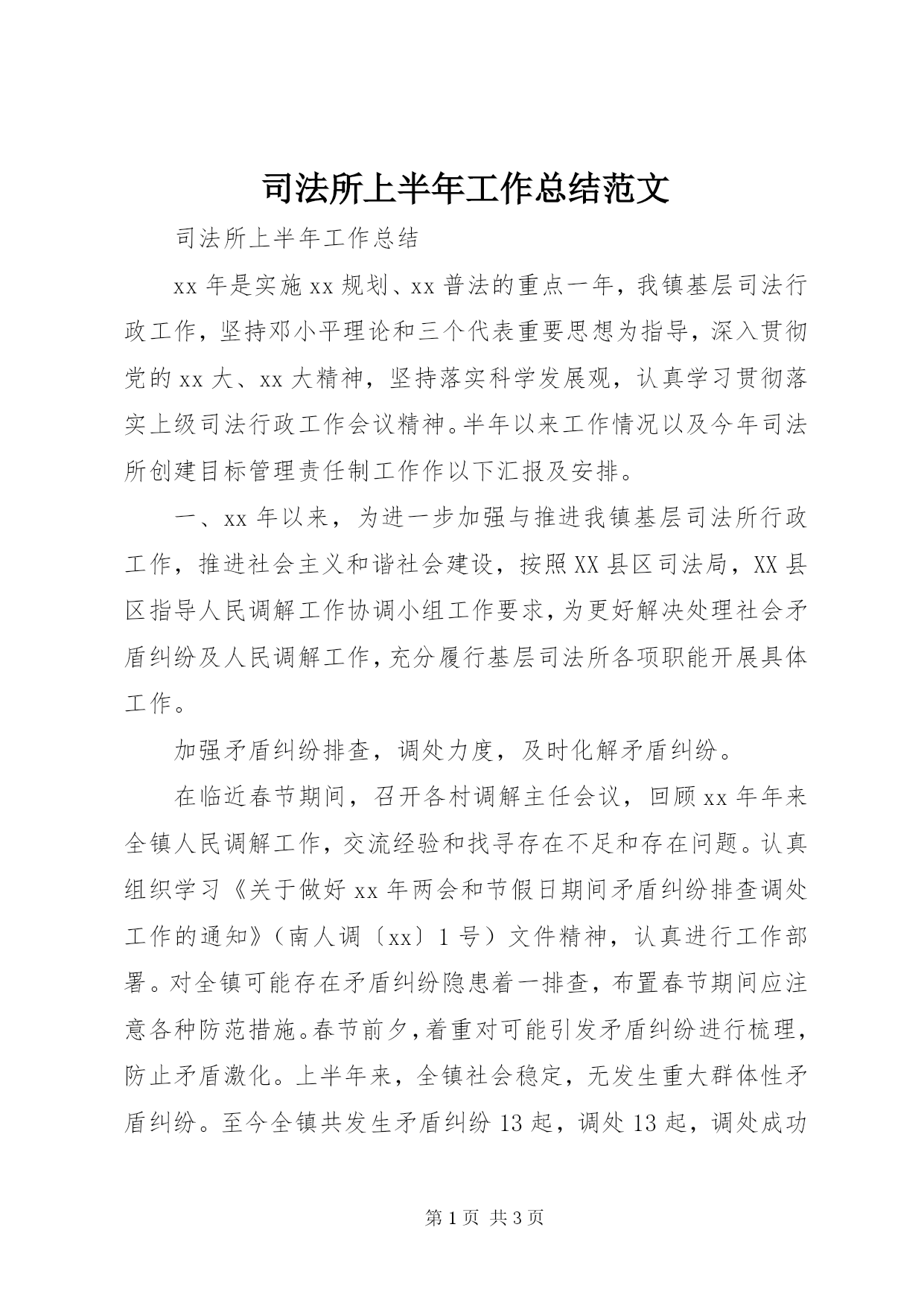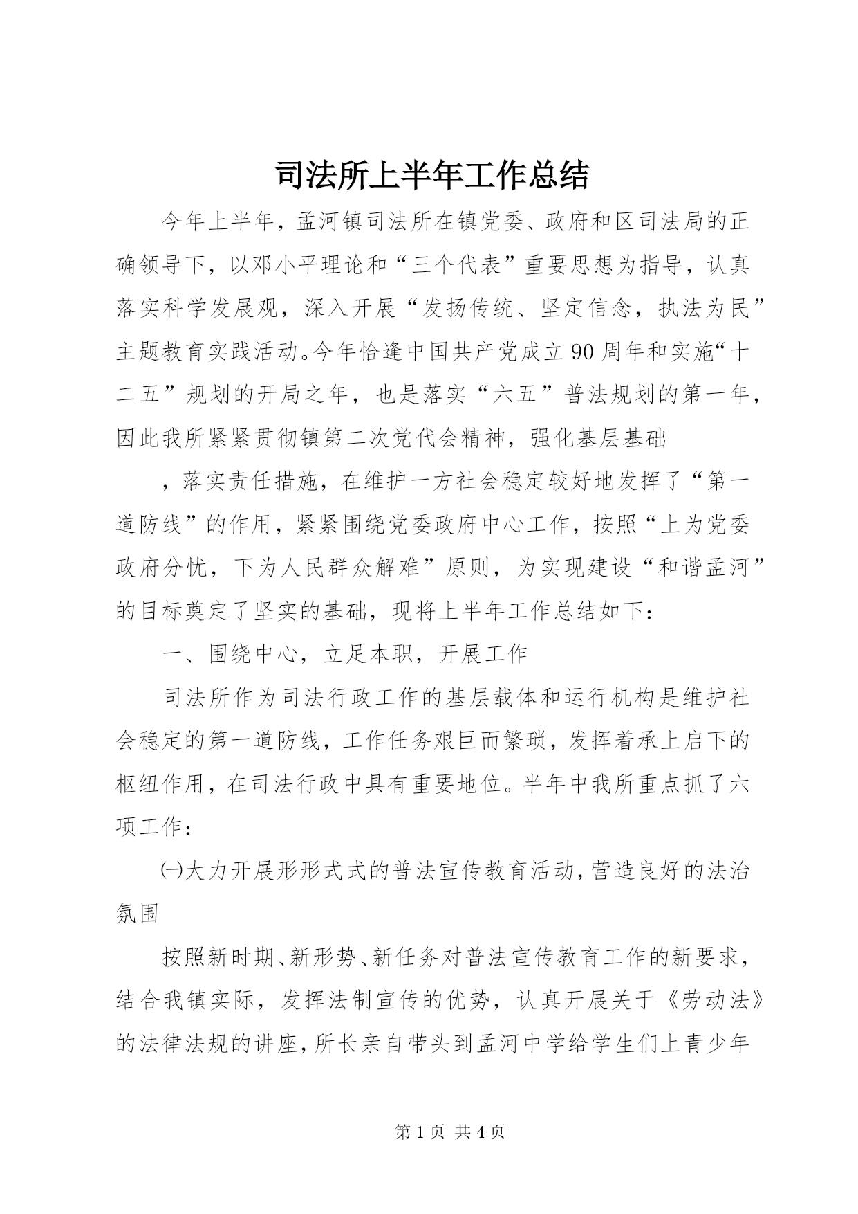 第PAGE\*Arabic\*MERGEFORMAT4页共NUMPAGES\*MERGEFORMAT4页司法所上半年工作总结今年上半年,孟河镇司法所在镇党委、政府和区司法局的正确领导下,以邓小平理论和“三个代表”重要思想为指导,认真落实科学发展观,深入开展“发扬传统、坚定信念,执法为民”主题教育实践活动。今年恰逢中国共产党成立90周年和实施“十二五”规划的开局之年,也是落实“六五”普法规划的第一年,因此我所紧紧贯彻镇第二次党代会精神,强化基层基础,落实责任措施,在维护一方社会稳定较好地发挥了“