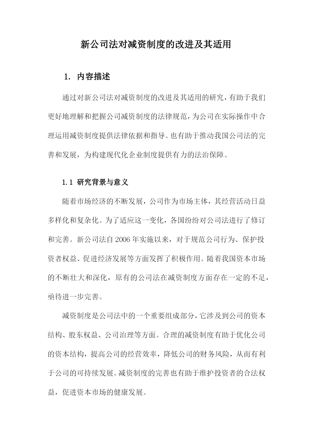 新公司法对减资制度的改进及其适用1.内容描述通过对新公司法对减资制度的改进及其适用的研究,有助于我们更好地理解和把握公司减资制度的法律规范,为公司在实际操作中合理运用减资制度提供法律依据和指导。也有助于推动我国公司法的完善和发展,为构建现代化企业制度提供有力的法治保障。1.1研究背景与意义随着市场经济的不断发展,公司作为市场主体,其经营活动日益多样化和复杂化。为了适应这一变化,各国纷纷对公司法进行了修订和完善。新公司法自2006年实施以来,对于规范公司行为、保护投资者权益、促进经济发展等方面发挥了积极作用