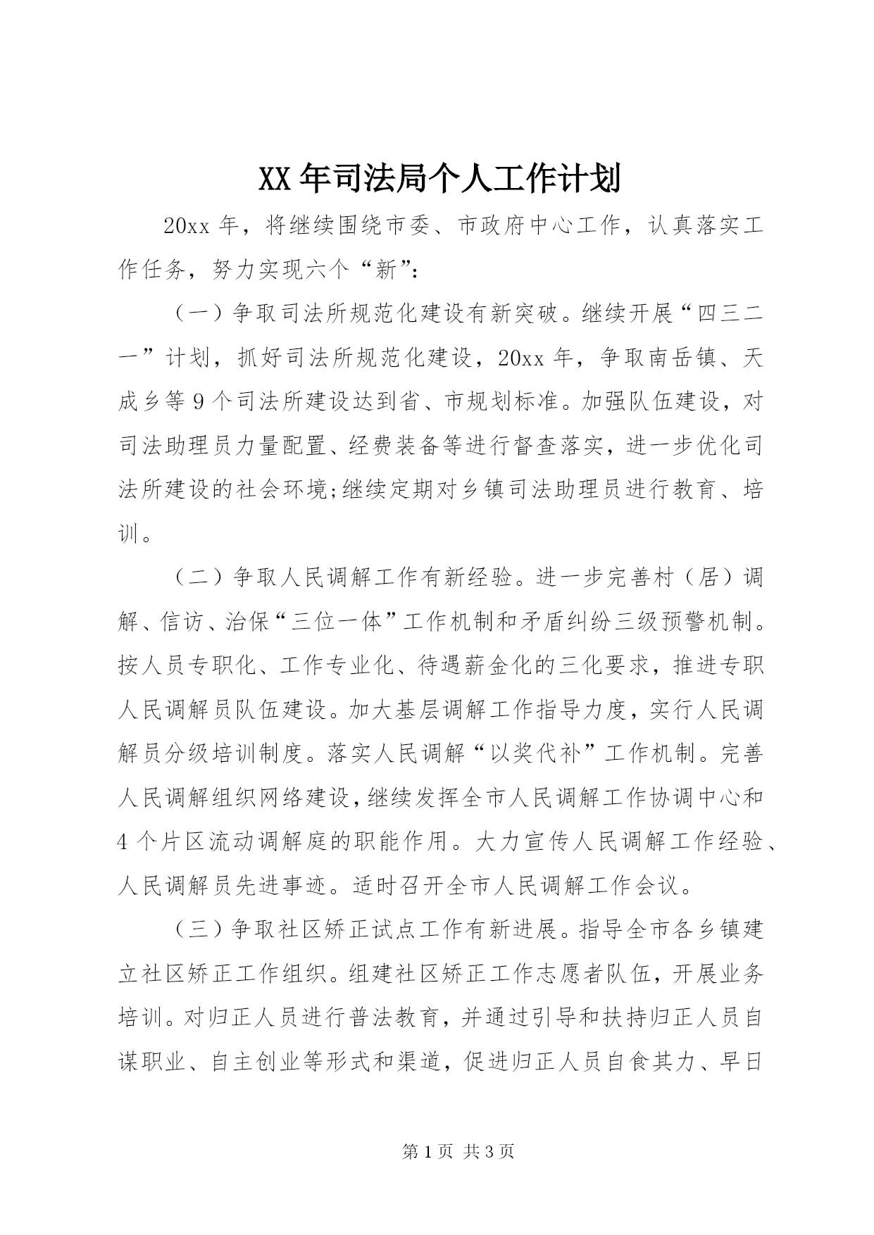 第PAGE\*Arabic\*MERGEFORMAT3页共NUMPAGES\*MERGEFORMAT3页XX年司法局个人工作计划20xx年,将继续围绕市委、市政府中心工作,认真落实工作任务,努力实现六个“新”:(一)争取司法所规范化建设有新突破。继续开展“四三二一”计划,抓好司法所规范化建设,20xx年,争取南岳镇、天成乡等9个司法所建设达到省、市规划标准。加强队伍建设,对司法助理员力量配置、经费装备等进行督查落实,进一步优化司法所建设的社会环境;继续定期对乡镇司法助理员进行教育、培训。(二)