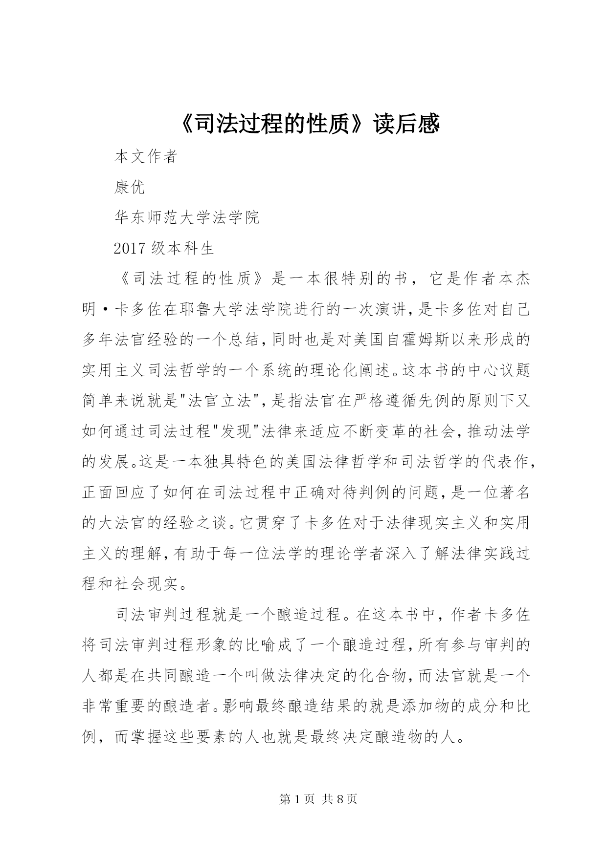 第PAGE\*Arabic\*MERGEFORMAT8页共NUMPAGES\*MERGEFORMAT8页《司法过程的性质》读后感本文作者康优华东师范大学法学院2017级本科生《司法过程的性质》是一本很特别的书,它是作者本杰明·卡多佐在耶鲁大学法学院进行的一次演讲,是卡多佐对自己多年法官经验的一个总结,同时也是对美国自霍姆斯以来形成的实用主义司法哲学的一个系统的理论化阐述。这本书的中心议题简单来说就是"法官立法",是指法官在严格遵循先例的原则下又如何通过司法过程"发现"法律来适应不断变革的社会,