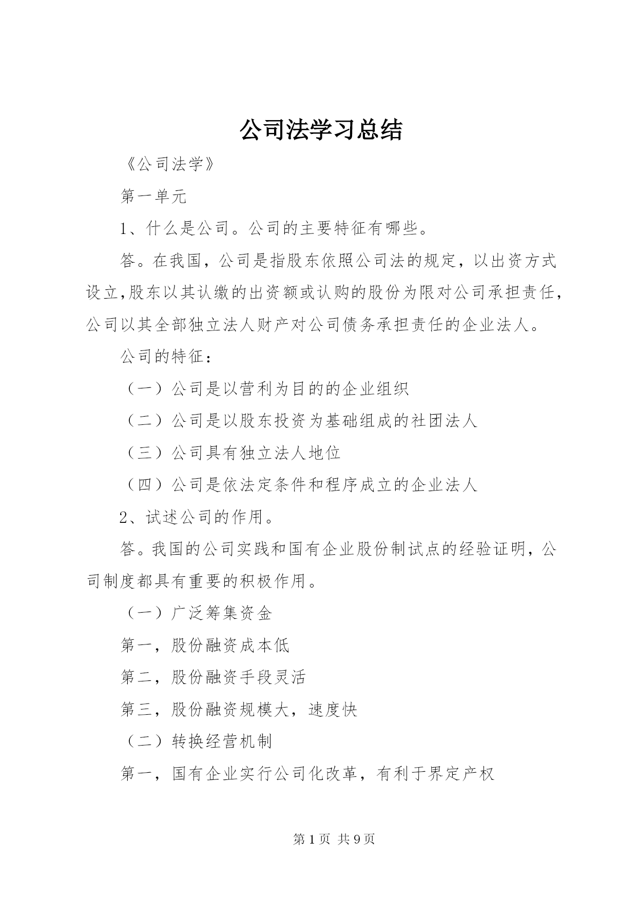 第PAGE\*Arabic\*MERGEFORMAT9页共NUMPAGES\*MERGEFORMAT9页公司法学习总结《公司法学》第一单元1、什么是公司。公司的主要特征有哪些。答。在我国,公司是指股东依照公司法的规定,以出资方式设立,股东以其认缴的出资额或认购的股份为限对公司承担责任,公司以其全部独立法人财产对公司债务承担责任的企业法人。公司的特征:(一)公司是以营利为目的的企业组织(二)公司是以股东投资为基础组成的社团法人(三)公司具有独立法人地位(四)公司是依法定条件和程序成立的企业法人2