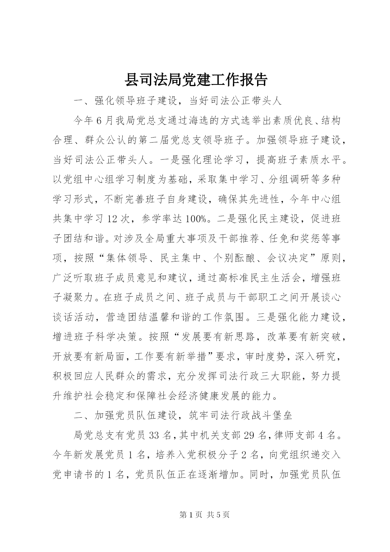 第PAGE\*Arabic\*MERGEFORMAT5页共NUMPAGES\*MERGEFORMAT5页县司法局党建工作报告一、强化领导班子建设,当好司法公正带头人今年6月我局党总支通过海选的方式选举出素质优良、结构合理、群众公认的第二届党总支领导班子。加强领导班子建设,当好司法公正带头人。一是强化理论学习,提高班子素质水平。以党组中心组学习制度为基础,采取集中学习、分组调研等多种学习形式,不断完善班子自身建设,确保其先进性,今年中心组共集中学习12次,参学率达100%。二是强化民主建设,促进