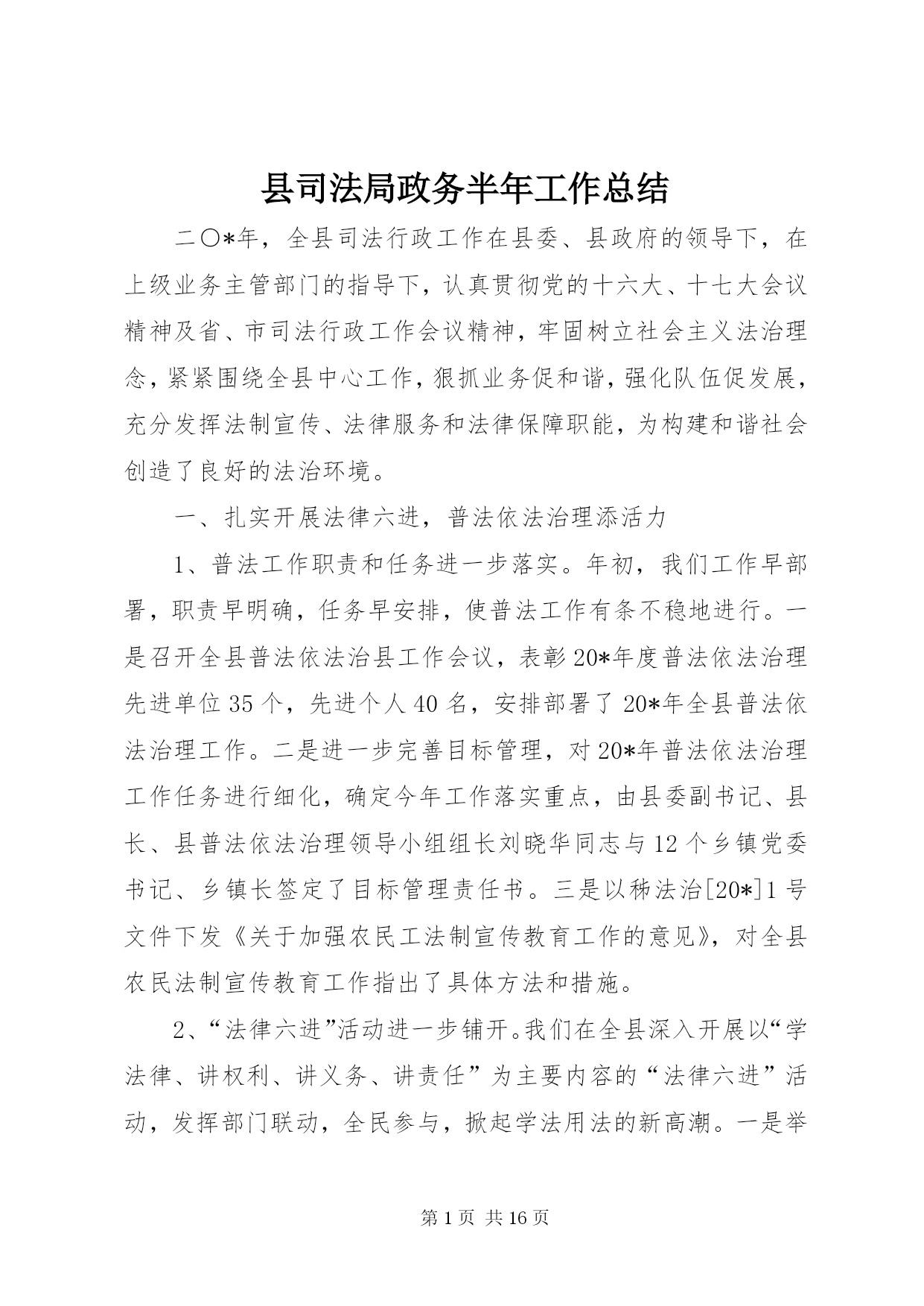 第PAGE\*Arabic\*MERGEFORMAT16页共NUMPAGES\*MERGEFORMAT16页县司法局政务半年工作总结二○*年,全县司法行政工作在县委、县政府的领导下,在上级业务主管部门的指导下,认真贯彻党的十六大、十七大会议精神及省、市司法行政工作会议精神,牢固树立社会主义法治理念,紧紧围绕全县中心工作,狠抓业务促和谐,强化队伍促发展,充分发挥法制宣传、法律服务和法律保障职能,为构建和谐社会创造了良好的法治环境。一、扎实开展法律六进,普法依法治理添活力1、普法工作职责和任务进一