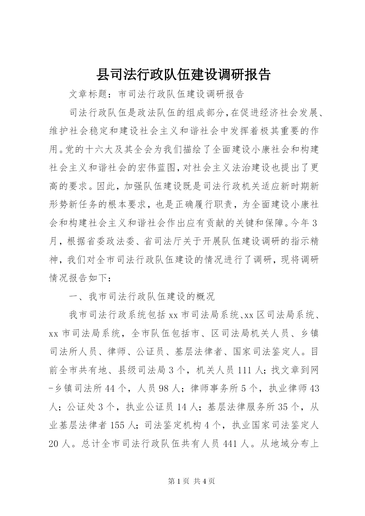 第PAGE\*Arabic\*MERGEFORMAT4页共NUMPAGES\*MERGEFORMAT4页县司法行政队伍建设调研报告文章标题:市司法行政队伍建设调研报告司法行政队伍是政法队伍的组成部分,在促进经济社会发展、维护社会稳定和建设社会主义和谐社会中发挥着极其重要的作用。党的十六大及其全会为我们描绘了全面建设小康社会和构建社会主义和谐社会的宏伟蓝图,对社会主义法治建设也提出了更高的要求。因此,加强队伍建设既是司法行政机关适应新时期新形势新任务的根本要求,也是正确履行职责,为全面建设小康社