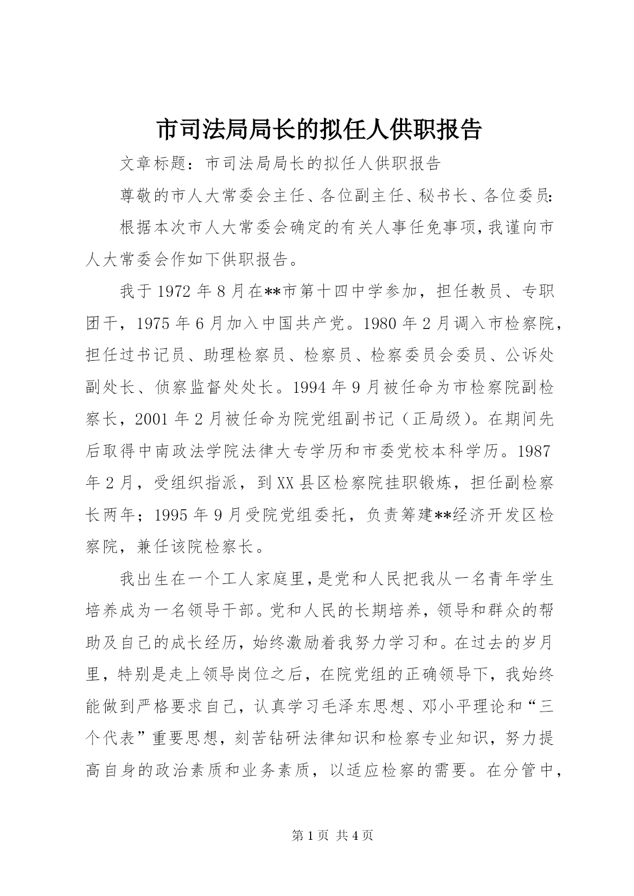 第PAGE\*Arabic\*MERGEFORMAT4页共NUMPAGES\*MERGEFORMAT4页市司法局局长的拟任人供职报告文章标题:市司法局局长的拟任人供职报告尊敬的市人大常委会主任、各位副主任、秘书长、各位委员:根据本次市人大常委会确定的有关人事任免事项,我谨向市人大常委会作如下供职报告。我于1972年8月在**市第十四中学参加,担任教员、专职团干,1975年6月加入中国共产党。1980年2月调入市检察院,担任过书记员、助理检察员、检察员、检察委员会委员、公诉处副处长、侦察监督处处