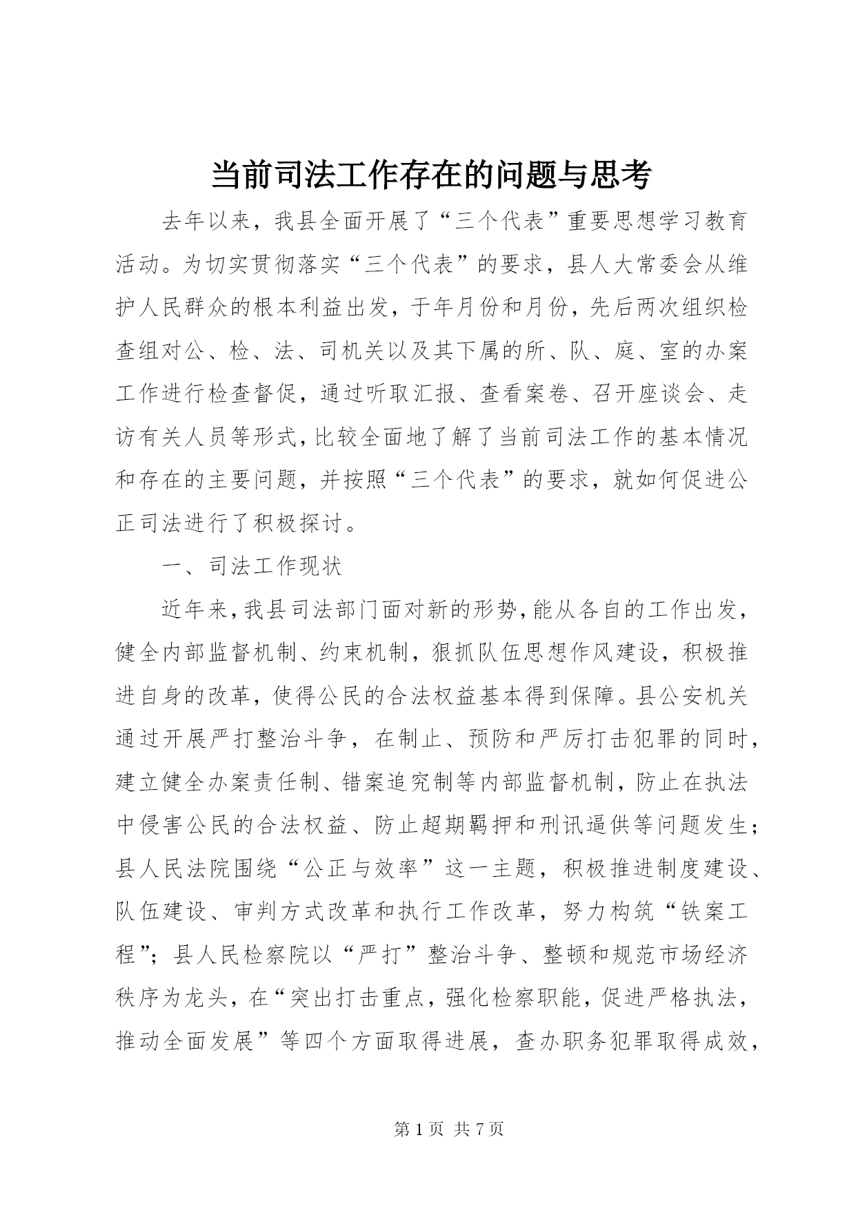 第PAGE\*Arabic\*MERGEFORMAT7页共NUMPAGES\*MERGEFORMAT7页当前司法工作存在的问题与思考去年以来,我县全面开展了“三个代表”重要思想学习教育活动。为切实贯彻落实“三个代表”的要求,县人大常委会从维护人民群众的根本利益出发,于年月份和月份,先后两次组织检查组对公、检、法、司机关以及其下属的所、队、庭、室的办案工作进行检查督促,通过听取汇报、查看案卷、召开座谈会、走访有关人员等形式,比较全面地了解了当前司法工作的基本情况和存在的主要问题,并按照“三个代表