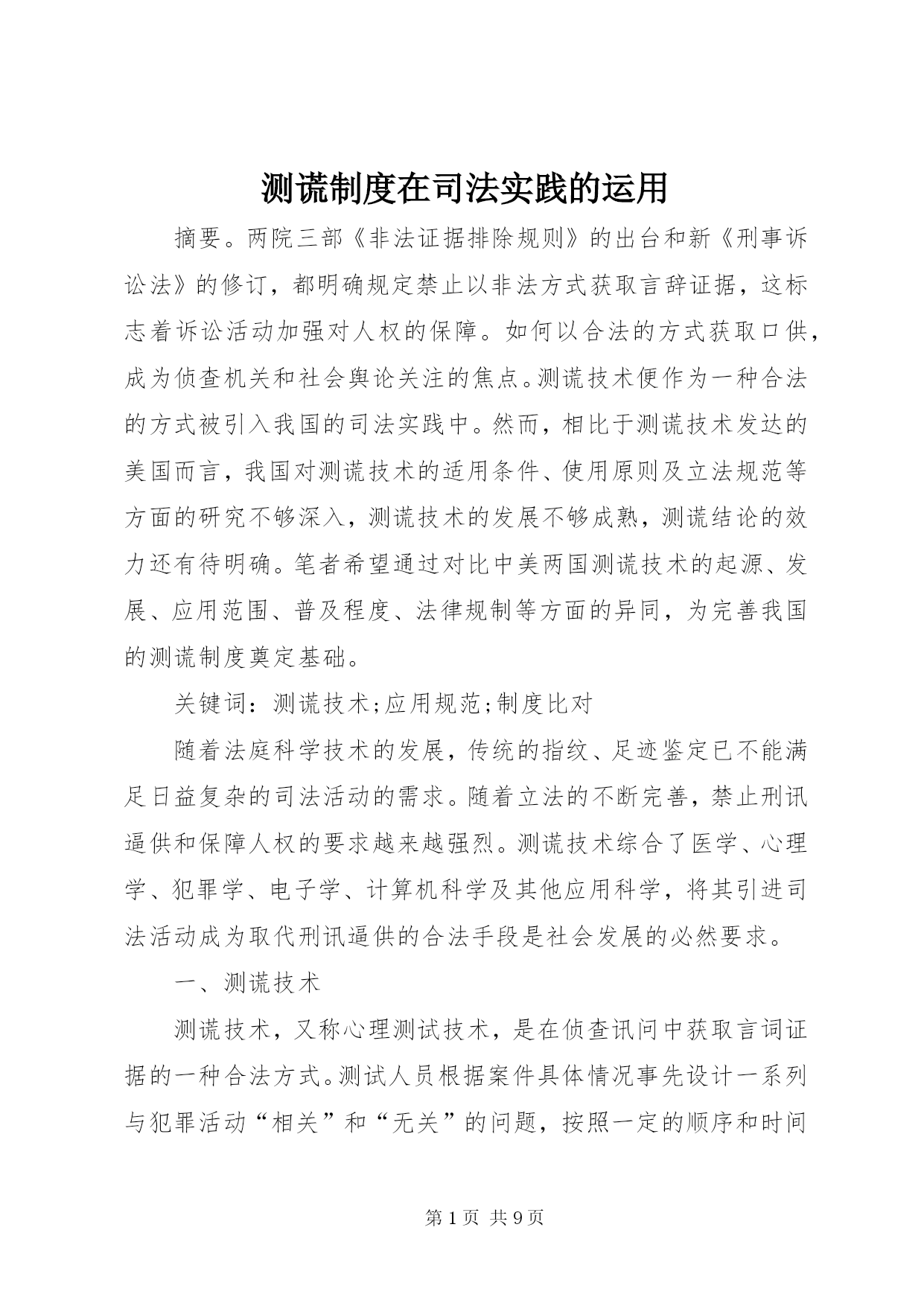 第PAGE\*Arabic\*MERGEFORMAT9页共NUMPAGES\*MERGEFORMAT9页测谎制度在司法实践的运用摘要。两院三部《非法证据排除规则》的出台和新《刑事诉讼法》的修订,都明确规定禁止以非法方式获取言辞证据,这标志着诉讼活动加强对人权的保障。如何以合法的方式获取口供,成为侦查机关和社会舆论关注的焦点。测谎技术便作为一种合法的方式被引入我国的司法实践中。然而,相比于测谎技术发达的美国而言,我国对测谎技术的适用条件、使用原则及立法规范等方面的研究不够深入,测谎技术的发展不够