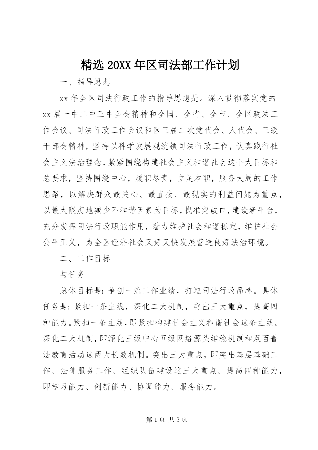 第PAGE\*Arabic\*MERGEFORMAT3页共NUMPAGES\*MERGEFORMAT3页精选20XX年区司法部工作计划一、指导思想xx年全区司法行政工作的指导思想是。深入贯彻落实党的xx届一中二中三中全会精神和全国、全省、全市、全区政法工作会议、司法行政工作会议和区三届二次党代会、人代会、三级干部会精神,坚持以科学发展观统领司法行政工作,认真践行社会主义法治理念,紧紧围绕构建社会主义和谐社会这个大目标和总要求,坚持围绕中心,履职尽责,立足本职,服务大局的工作思路,以解决群众最关