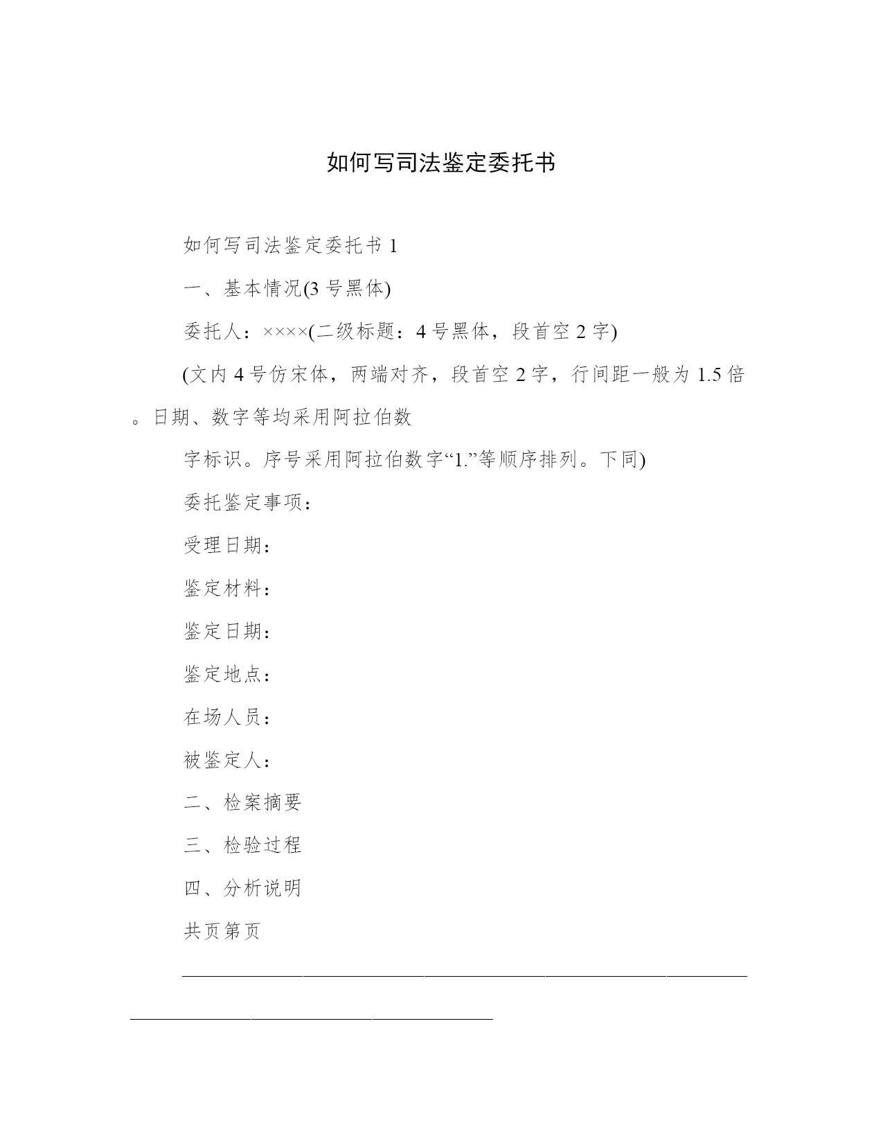 如何写司法鉴定委托书如何写司法鉴定委托书1一、基本情况(3号黑体)委托人:××××(二级标题:4号黑体,段首空2字)(文内4号仿宋体,两端对齐,段首空2字,行间距一般为1.5倍。日期、数字等均采用阿拉伯数字标识。序号采用阿拉伯数字“1.”等顺序排列。下同)委托鉴定事项:受理日期:鉴定材料:鉴定日期:鉴定地点:在场人员:被鉴定人:二、检案摘要三、检验过程四、分析说明共页第页——————————————————————————————————————————————五、鉴定意见六、落款司法鉴定人签名或者盖章司