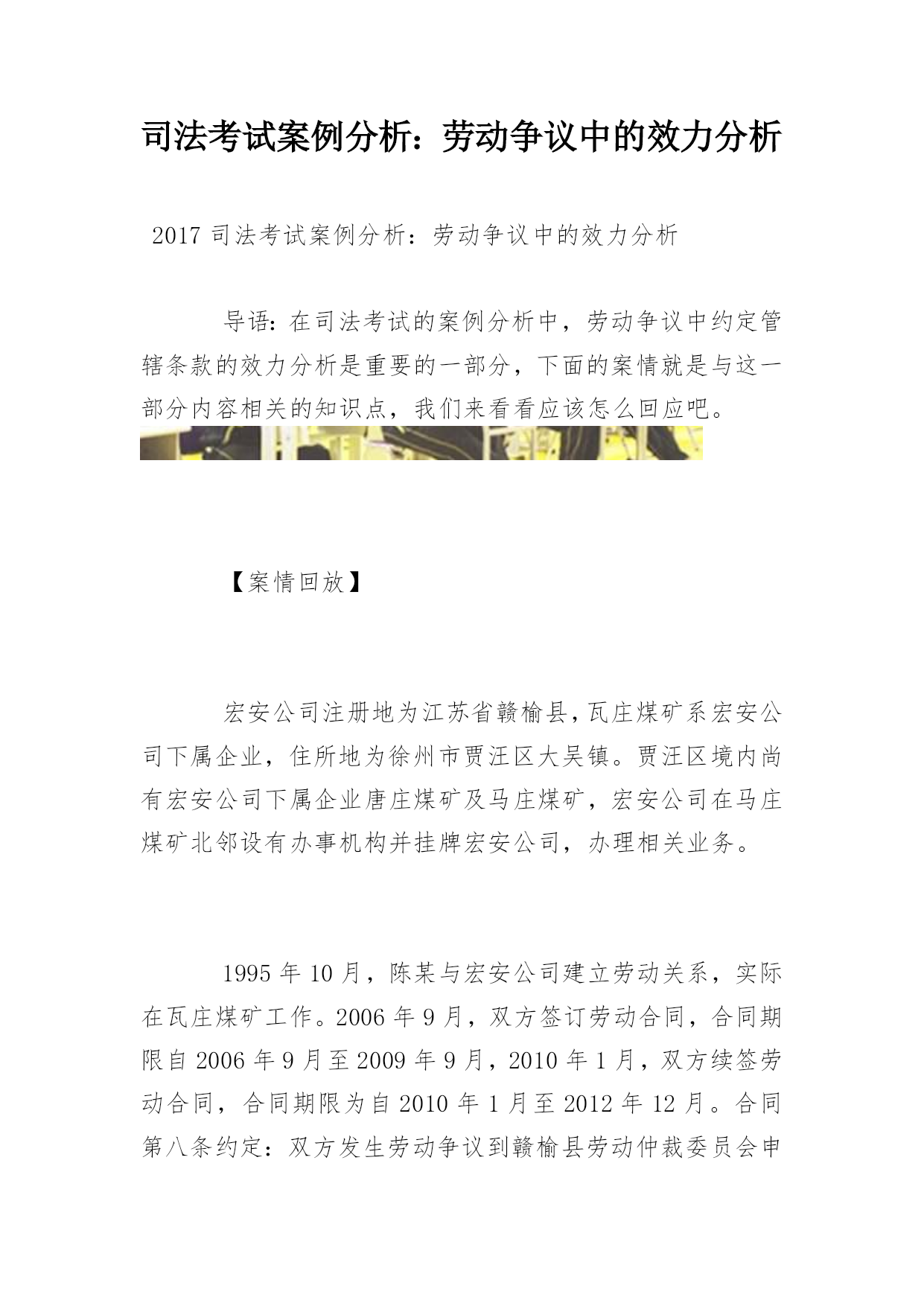 司法考试案例分析:劳动争议中的效力分析2017司法考试案例分析:劳动争议中的效力分析导语:在司法考试的案例分析中,劳动争议中约定管辖条款的效力分析是重要的一部分,下面的案情就是与这一部分内容相关的知识点,我们来看看应该怎么回应吧。【案情回放】宏安公司注册地为江苏省赣榆县,瓦庄煤矿系宏安公司下属企业,住所地为徐州市贾汪区大吴镇。贾汪区境内尚有宏安公司下属企业唐庄煤矿及马庄煤矿,宏安公司在马庄煤矿北邻设有办事机构并挂牌宏安公司,办理相关业务。1995年10月,陈某与宏安公司建立劳动关系,实际在瓦庄煤矿工作。2