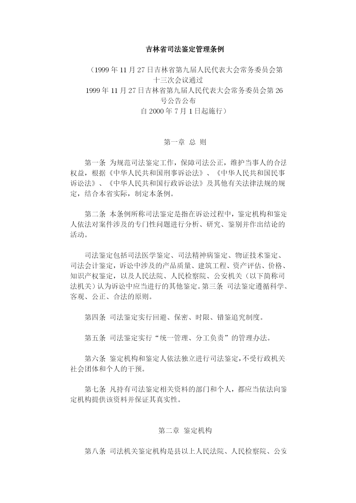 吉林省司法鉴定管理条例(1999年11月27日吉林省第九届人民代表大会常务委员会第十三次会议通过1999年11月27日吉林省第九届人民代表大会常务委员会第26号公告公布自2000年7月1日起施行)第一章总则第一条为规范司法鉴定工作,保障司法公正,维护当事人的合法权益,根据《中华人民共和国刑事诉讼法》、《中华人民共和国民事诉讼法》、《中华人民共和国行政诉讼法》及其他有关法律法规的规定,结合本省实际,制定本条例。第二条本条例所称司法鉴定是指在诉讼过程中,鉴定机构和鉴定人依法对案件涉及的专门性问题进行分析、研究