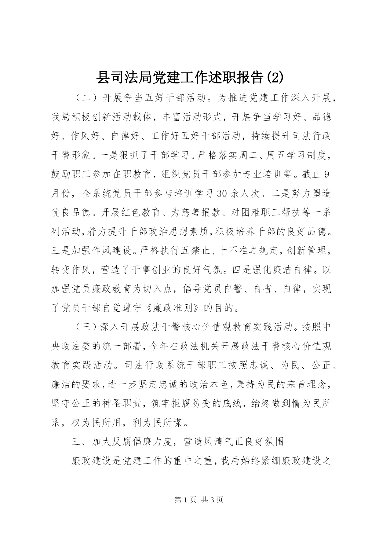 第PAGE\*Arabic\*MERGEFORMAT3页共NUMPAGES\*MERGEFORMAT3页县司法局党建工作述职报告(2)(二)开展争当五好干部活动。为推进党建工作深入开展,我局积极创新活动载体,丰富活动形式,开展争当学习好、品德好、作风好、自律好、工作好五好干部活动,持续提升司法行政干警形象。一是狠抓了干部学习。严格落实周二、周五学习制度,鼓励职工参加在职教育,组织党员干部参加专业培训等。截止9月份,全系统党员干部参与培训学习30余人次。二是努力塑造优良品德。开展红色教育、为慈善