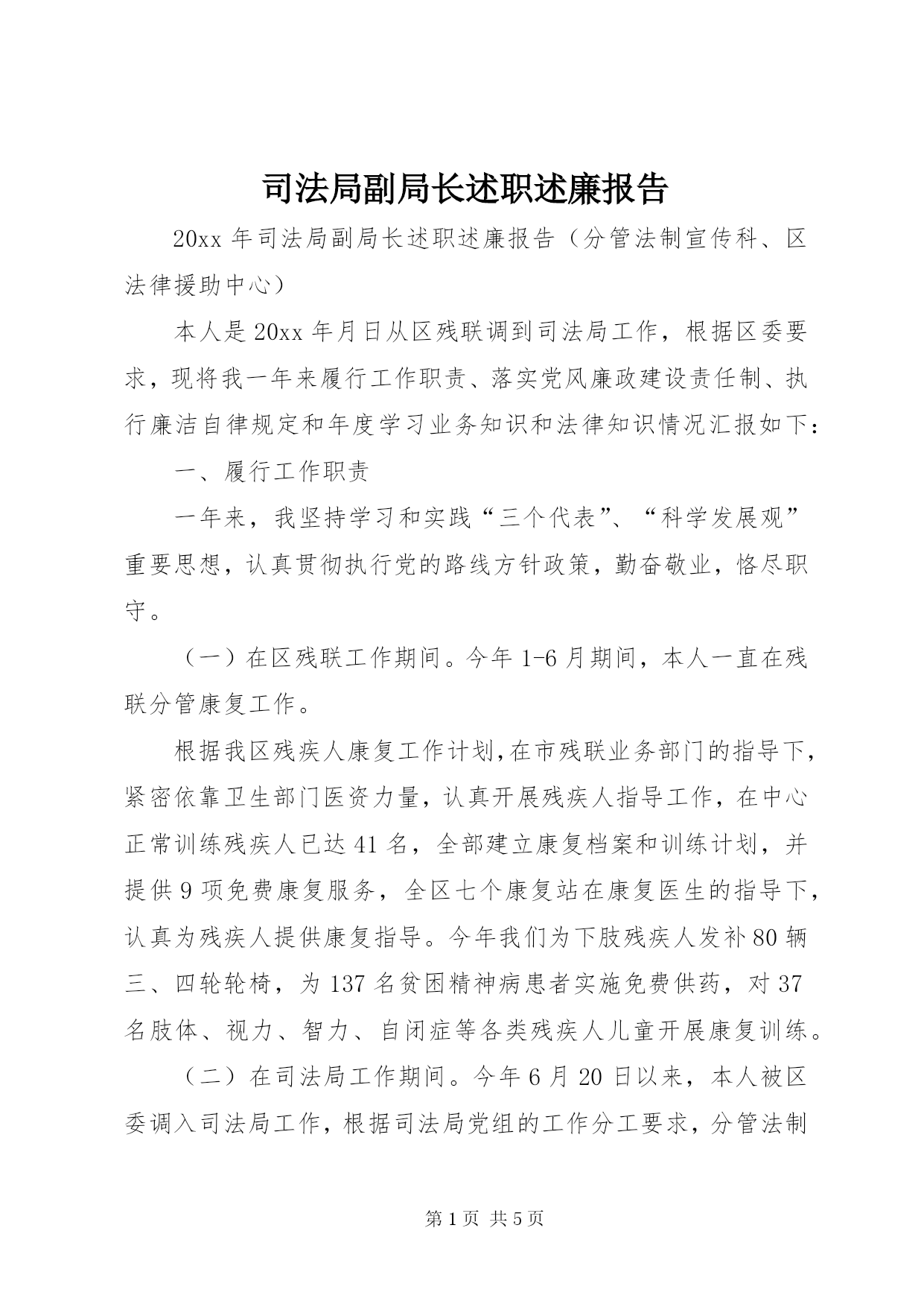 第PAGE\*Arabic\*MERGEFORMAT5页共NUMPAGES\*MERGEFORMAT5页司法局副局长述职述廉报告20xx年司法局副局长述职述廉报告(分管法制宣传科、区法律援助中心)本人是20xx年月日从区残联调到司法局工作,根据区委要求,现将我一年来履行工作职责、落实党风廉政建设责任制、执行廉洁自律规定和年度学习业务知识和法律知识情况汇报如下:一、履行工作职责一年来,我坚持学习和实践“三个代表”、“科学发展观”重要思想,认真贯彻执行党的路线方针政策,勤奋敬业,恪尽职守。(一)在