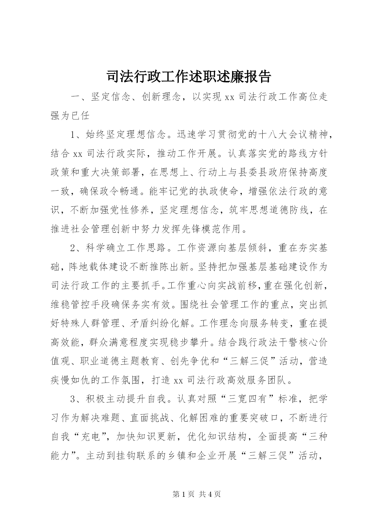 第PAGE\*Arabic\*MERGEFORMAT4页共NUMPAGES\*MERGEFORMAT4页司法行政工作述职述廉报告一、坚定信念、创新理念,以实现xx司法行政工作高位走强为已任1、始终坚定理想信念。迅速学习贯彻党的十八大会议精神,结合xx司法行政实际,推动工作开展。认真落实党的路线方针政策和重大决策部署,在思想上、行动上与县委县政府保持高度一致,确保政令畅通。能牢记党的执政使命,增强依法行政的意识,不断加强党性修养,坚定理想信念,筑牢思想道德防线,在推进社会管理创新中努力发挥先锋模
