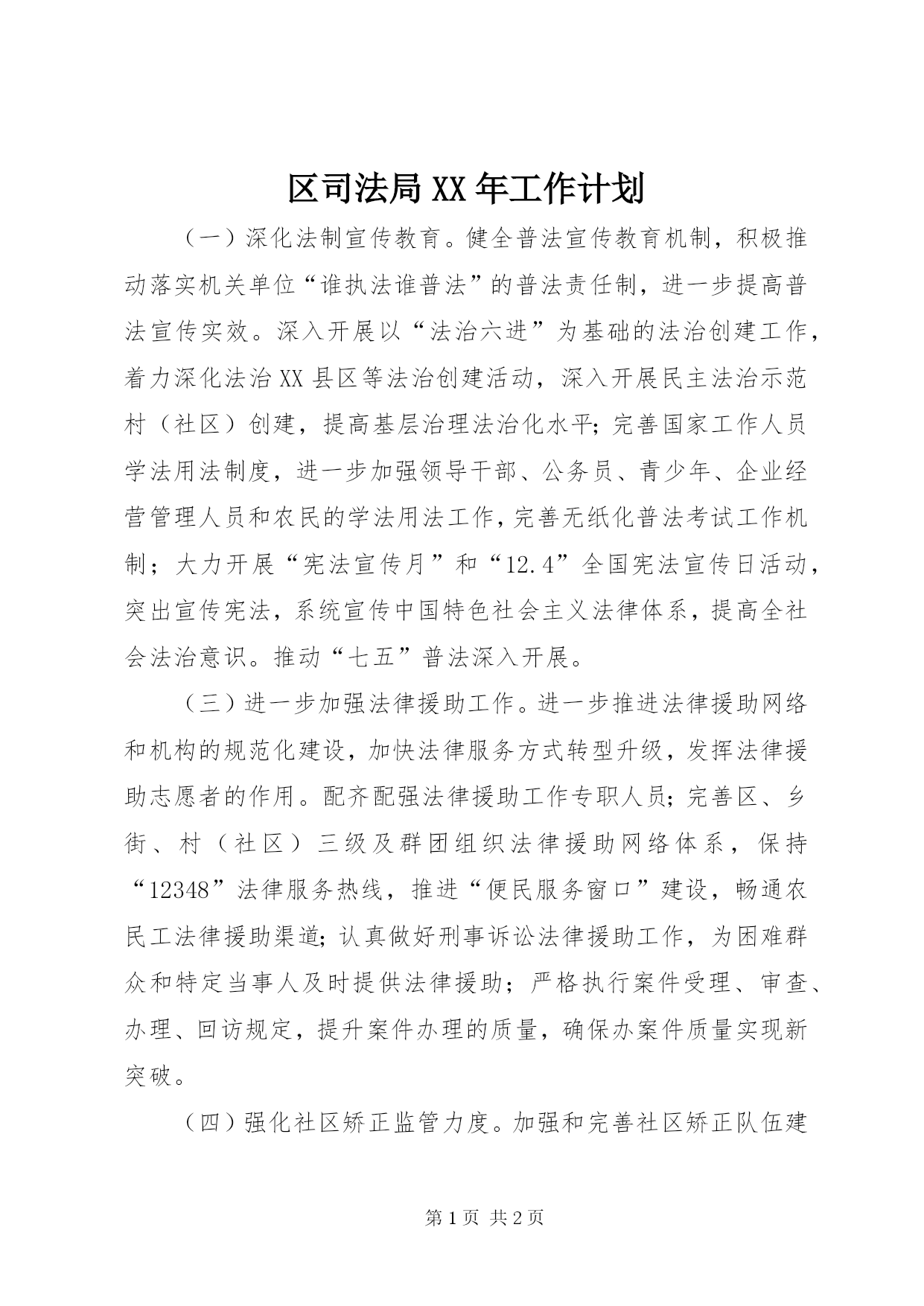 第PAGE\*Arabic\*MERGEFORMAT2页共NUMPAGES\*MERGEFORMAT2页区司法局XX年工作计划(一)深化法制宣传教育。健全普法宣传教育机制,积极推动落实机关单位“谁执法谁普法”的普法责任制,进一步提高普法宣传实效。深入开展以“法治六进”为基础的法治创建工作,着力深化法治XX县区等法治创建活动,深入开展民主法治示范村(社区)创建,提高基层治理法治化水平;完善国家工作人员学法用法制度,进一步加强领导干部、公务员、青少年、企业经营管理人员和农民的学法用法工作,完善无纸