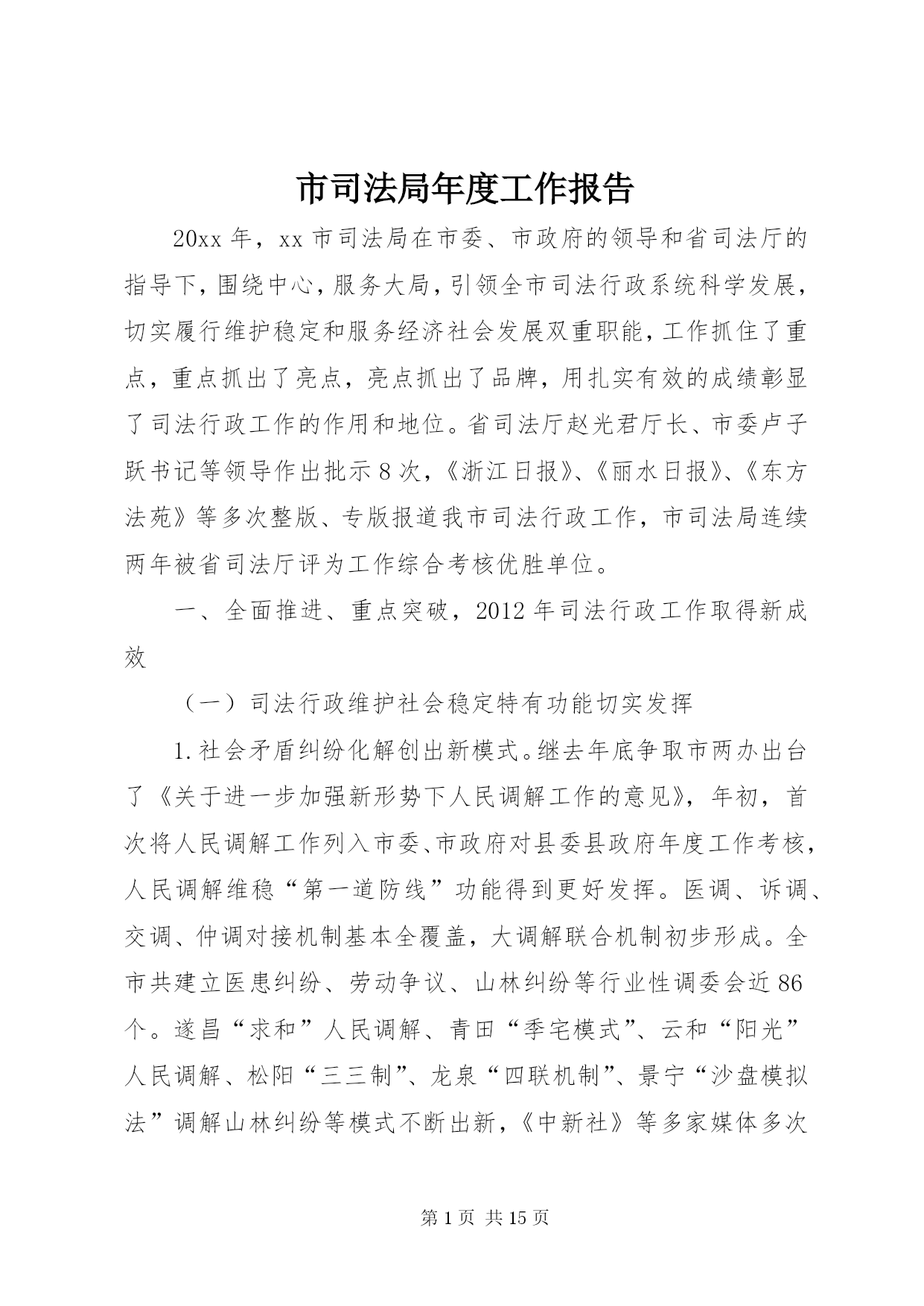 第PAGE\*Arabic\*MERGEFORMAT15页共NUMPAGES\*MERGEFORMAT15页市司法局年度工作报告20xx年,xx市司法局在市委、市政府的领导和省司法厅的指导下,围绕中心,服务大局,引领全市司法行政系统科学发展,切实履行维护稳定和服务经济社会发展双重职能,工作抓住了重点,重点抓出了亮点,亮点抓出了品牌,用扎实有效的成绩彰显了司法行政工作的作用和地位。省司法厅赵光君厅长、市委卢子跃书记等领导作出批示8次,《浙江日报》、《丽水日报》、《东方法苑》等多次整版、专版报道我