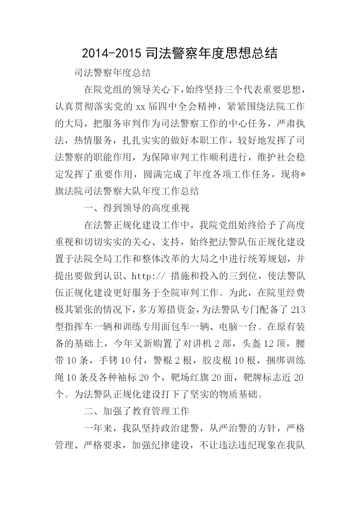 2014-2015司法警察年度思想总结司法警察年度总结在院党组的领导关心下,始终坚持三个代表重要思想,认真贯彻落实党的xx届四中全会精神,紧紧围绕法院工作的大局,把服务审判作为司法警察工作的中心任务,严肃执法,热情服务,扎扎实实的做好本职工作,较好地发挥了司法警察的职能作用,为保障审判工作顺利进行,维护社会稳定发挥了重要作用,圆满完成了年度各项工作任务,现将*旗法院司法警察大队年度工作总结一、得到领导的高度重视在法警正规化建设工作中,我院党组始终给予了高度重视和切切实实的关心、支持,始终把法警队伍正规化建