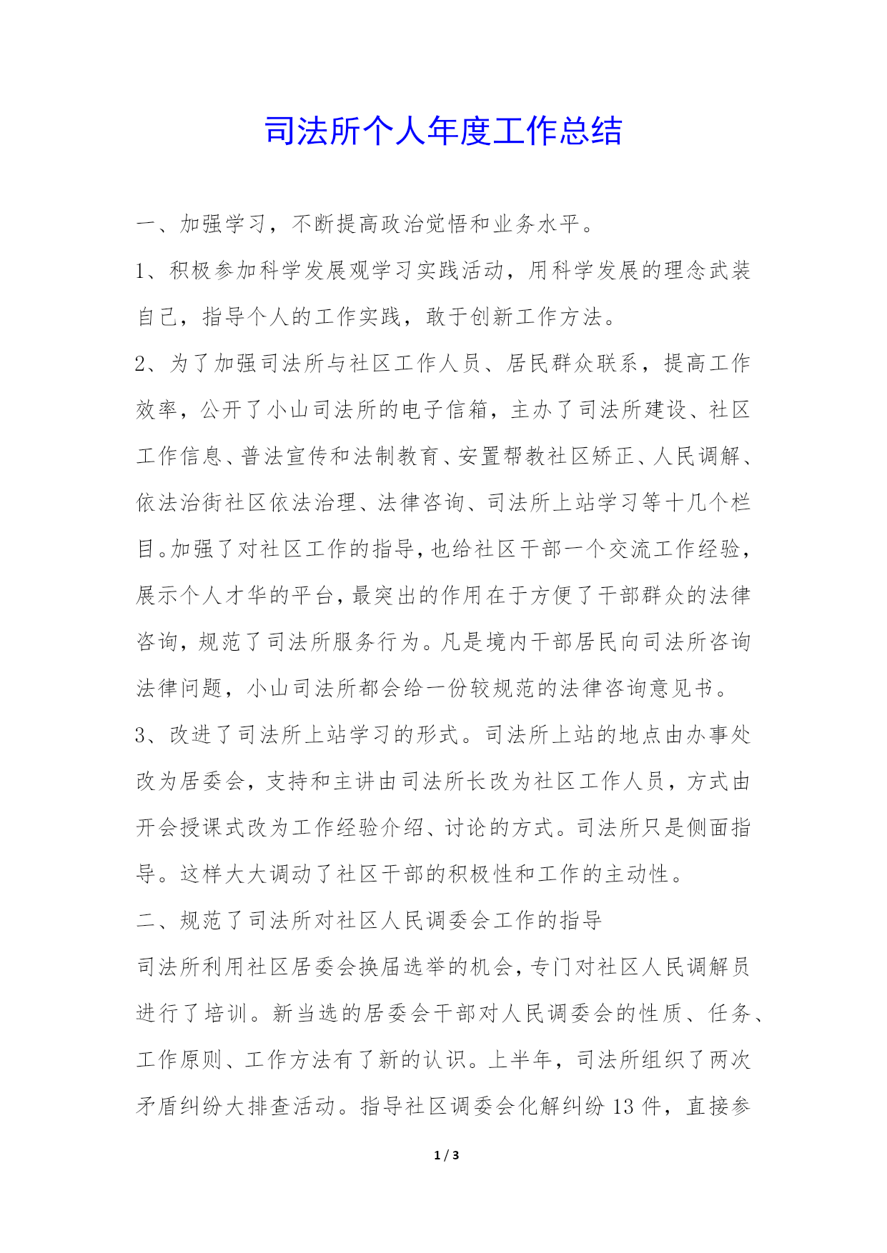 PAGE3/NUMPAGES3司法所个人年度工作总结一、加强学习,不断提高政治觉悟和业务水平。1、积极参加科学发展观学习实践活动,用科学发展的理念武装自己,指导个人的工作实践,敢于创新工作方法。2、为了加强司法所与社区工作人员、居民群众联系,提高工作效率,公开了小山司法所的电子信箱,主办了司法所建设、社区工作信息、普法宣传和法制教育、安置帮教社区矫正、人民调解、依法治街社区依法治理、法律咨询、司法所上站学习等十几个栏目。加强了对社区工作的指导,也给社区干部一个交流工作经验,展示个人才华的平台,