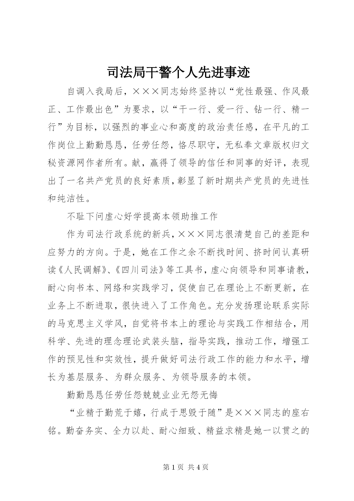第PAGE\*Arabic\*MERGEFORMAT4页共NUMPAGES\*MERGEFORMAT4页司法局干警个人先进事迹自调入我局后,×××同志始终坚持以“党性最强、作风最正、工作最出色”为要求,以“干一行、爱一行、钻一行、精一行”为目标,以强烈的事业心和高度的政治责任感,在平凡的工作岗位上勤勤恳恳,任劳任怨,恪尽职守,无私奉文章版权归文秘资源网作者所有。献,赢得了领导的信任和同事的好评,表现出了一名共产党员的良好素质,彰显了新时期共产党员的先进性和纯洁性。不耻下问虚心好学提高本领助推工