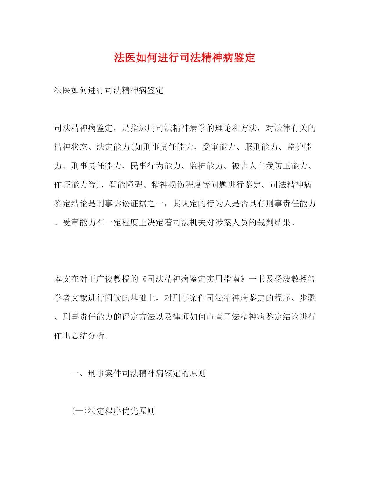 PAGE此资料由网络收集而来,如有侵权请告知上传者立即删除。资料共分享,我们负责传递知识。法医如何进行司法精神病鉴定法医如何进行司法精神病鉴定司法精神病鉴定,是指运用司法精神病学的理论和方法,对法律有关的精神状态、法定能力(如刑事责任能力、受审能力、服刑能力、监护能力、刑事责任能力、民事行为能力、监护能力、被害人自我防卫能力、作证能力等)、智能障碍、精神损伤程度等问题进行鉴定。司法精神病鉴定结论是刑事诉讼证据之一,其认定的行为人是否具有刑事责任能力、受审能力在一定程度上决定着司法机关对涉案人员的裁判
