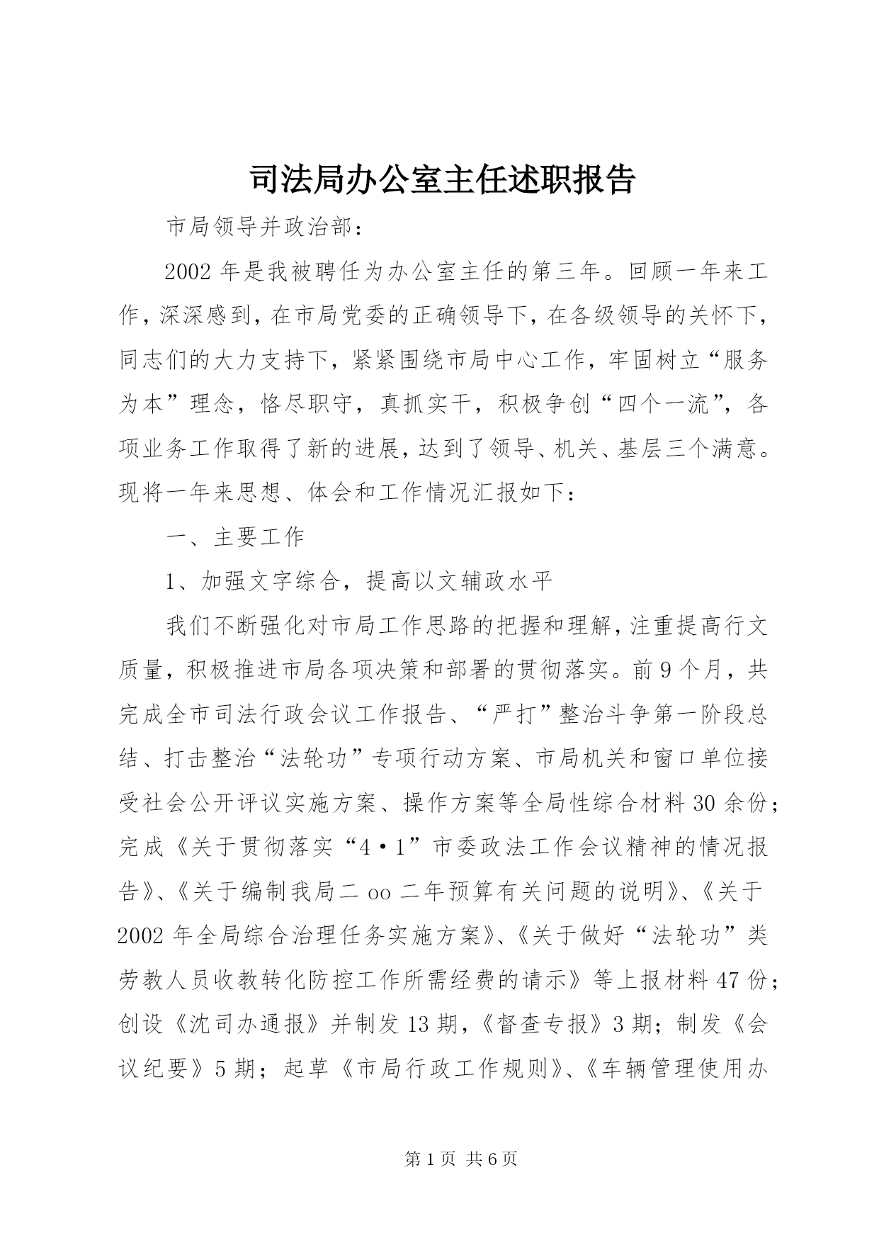 第PAGE\*Arabic\*MERGEFORMAT6页共NUMPAGES\*MERGEFORMAT6页司法局办公室主任述职报告市局领导并政治部:2002年是我被聘任为办公室主任的第三年。回顾一年来工作,深深感到,在市局党委的正确领导下,在各级领导的关怀下,同志们的大力支持下,紧紧围绕市局中心工作,牢固树立“服务为本”理念,恪尽职守,真抓实干,积极争创“四个一流”,各项业务工作取得了新的进展,达到了领导、机关、基层三个满意。现将一年来思想、体会和工作情况汇报如下:一、主要工作1、加强文字综合,