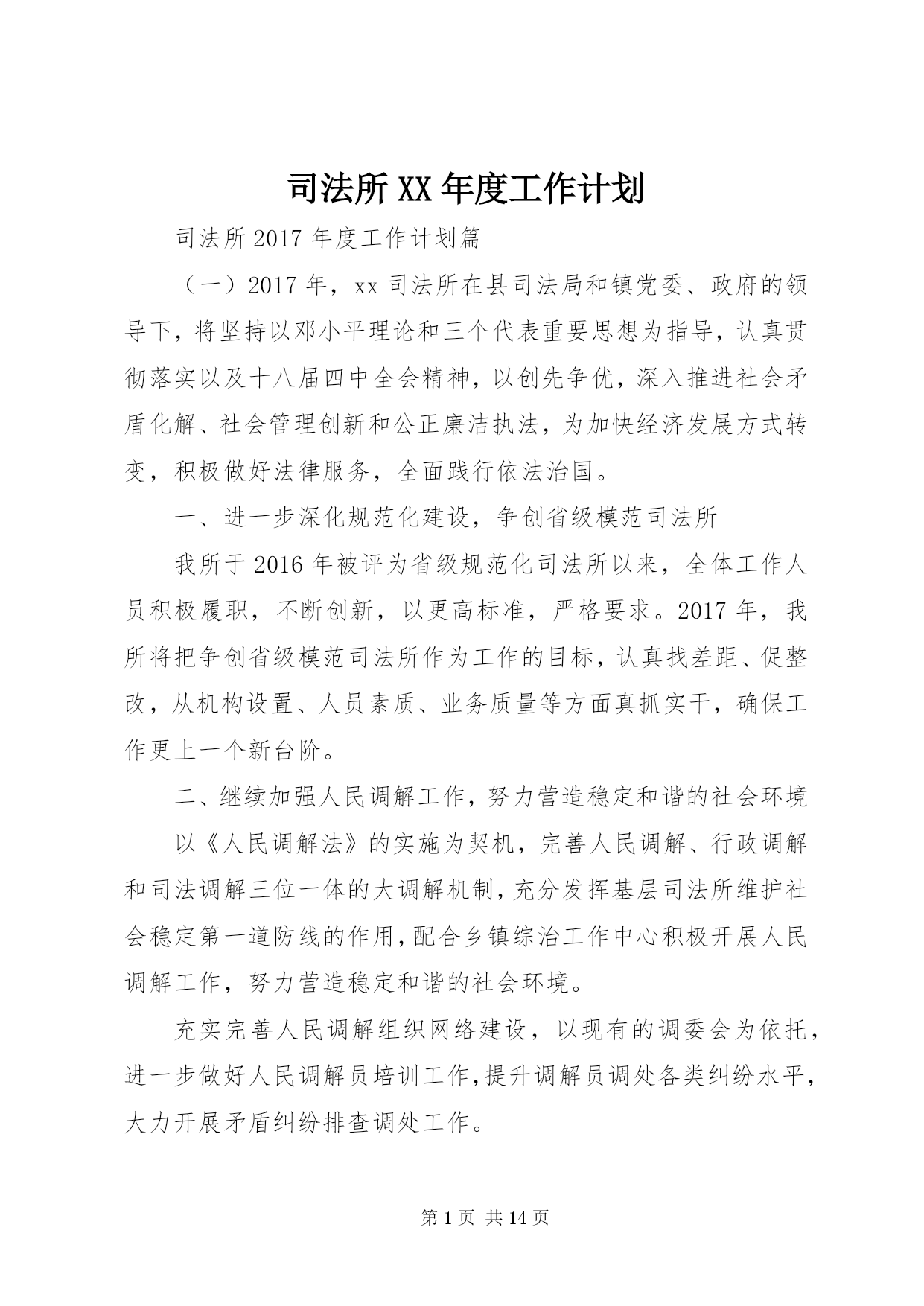 第PAGE\*Arabic\*MERGEFORMAT14页共NUMPAGES\*MERGEFORMAT14页司法所XX年度工作计划司法所2017年度工作计划篇(一)2017年,xx司法所在县司法局和镇党委、政府的领导下,将坚持以邓小平理论和三个代表重要思想为指导,认真贯彻落实以及十八届四中全会精神,以创先争优,深入推进社会矛盾化解、社会管理创新和公正廉洁执法,为加快经济发展方式转变,积极做好法律服务,全面践行依法治国。一、进一步深化规范化建设,争创省级模范司法所我所于2016年被评为省级规范化
