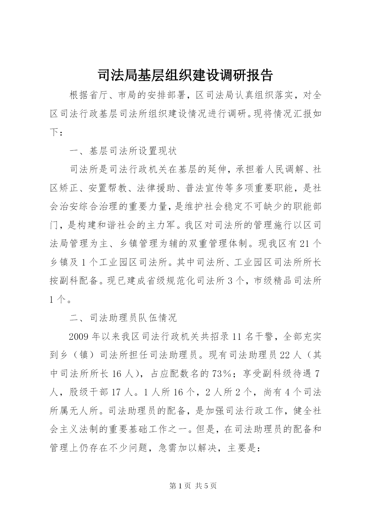 第PAGE\*Arabic\*MERGEFORMAT5页共NUMPAGES\*MERGEFORMAT5页司法局基层组织建设调研报告根据省厅、市局的安排部署,区司法局认真组织落实,对全区司法行政基层司法所组织建设情况进行调研。现将情况汇报如下:一、基层司法所设置现状司法所是司法行政机关在基层的延伸,承担着人民调解、社区矫正、安置帮教、法律援助、普法宣传等多项重要职能,是社会治安综合治理的重要力量,是维护社会稳定不可缺少的职能部门,是构建和谐社会的主力军。我区对司法所的管理施行以区司法局管理为主、
