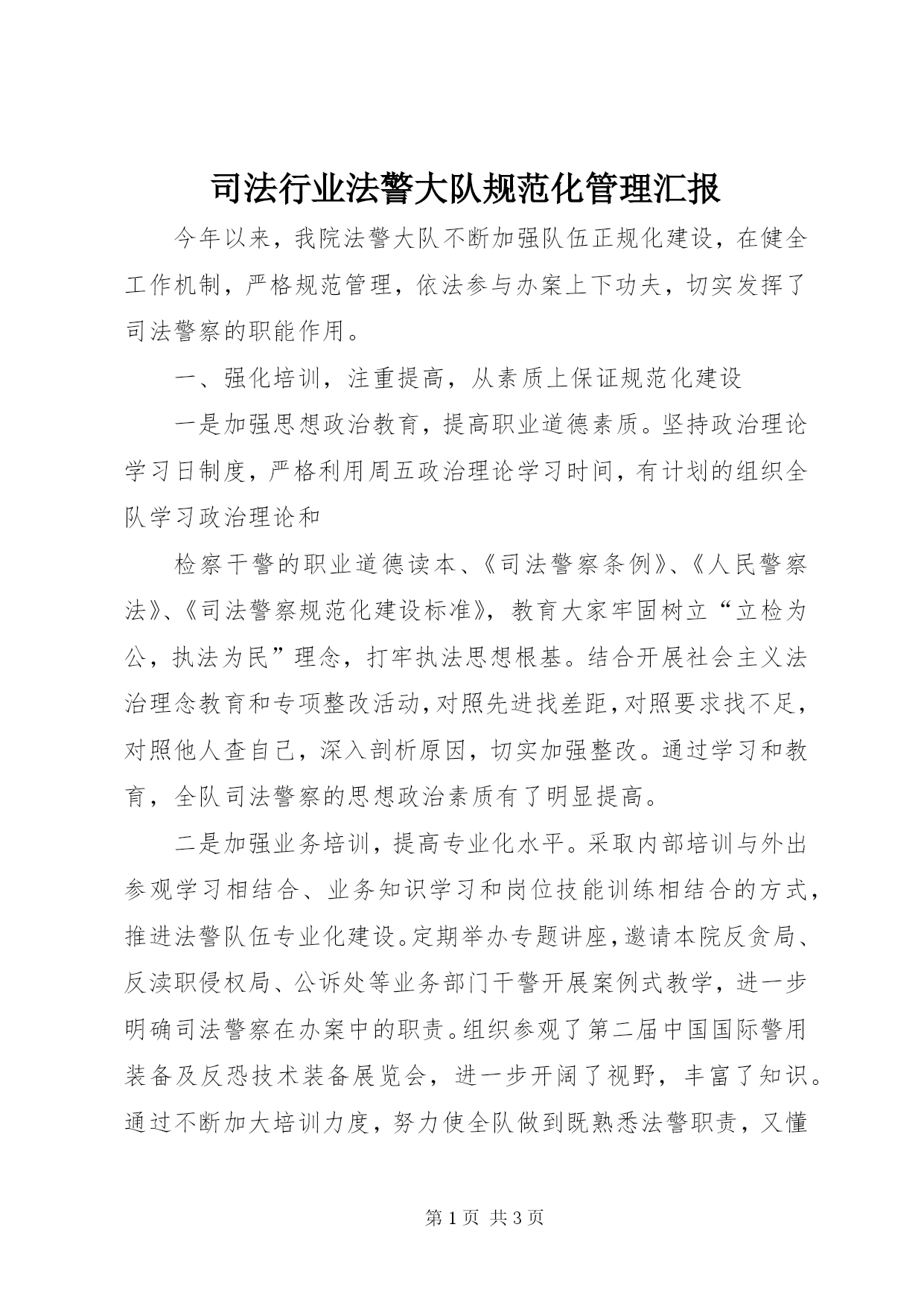 第PAGE\*Arabic\*MERGEFORMAT3页共NUMPAGES\*MERGEFORMAT3页司法行业法警大队规范化管理汇报今年以来,我院法警大队不断加强队伍正规化建设,在健全工作机制,严格规范管理,依法参与办案上下功夫,切实发挥了司法警察的职能作用。一、强化培训,注重提高,从素质上保证规范化建设一是加强思想政治教育,提高职业道德素质。坚持政治理论学习日制度,严格利用周五政治理论学习时间,有计划的组织全队学习政治理论和检察干警的职业道德读本、《司法警察条例》、《人民警察法》、《司法警