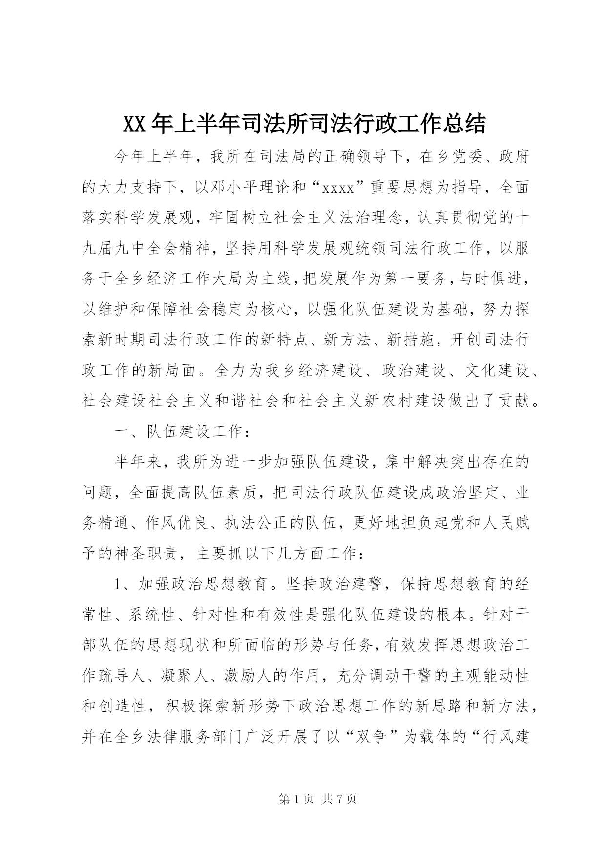 第PAGE\*Arabic\*MERGEFORMAT7页共NUMPAGES\*MERGEFORMAT7页XX年上半年司法所司法行政工作总结今年上半年,我所在司法局的正确领导下,在乡党委、政府的大力支持下,以邓小平理论和“xxxx”重要思想为指导,全面落实科学发展观,牢固树立社会主义法治理念,认真贯彻党的十九届九中全会精神,坚持用科学发展观统领司法行政工作,以服务于全乡经济工作大局为主线,把发展作为第一要务,与时俱进,以维护和保障社会稳定为核心,以强化队伍建设为基础,努力探索新时期司法行政工作的