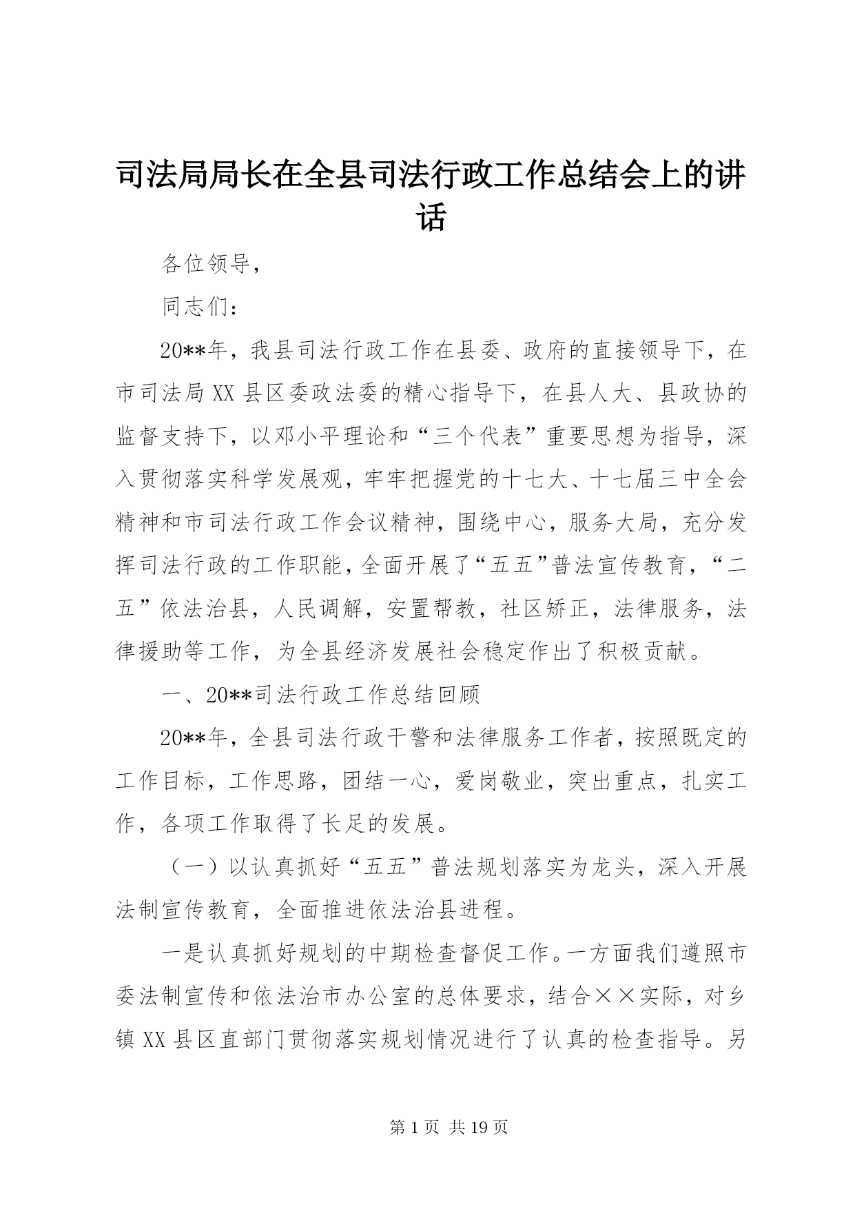 第PAGE\*Arabic\*MERGEFORMAT19页共NUMPAGES\*MERGEFORMAT19页司法局局长在全县司法行政工作总结会上的讲话各位领导,同志们:20**年,我县司法行政工作在县委、政府的直接领导下,在市司法局XX县区委政法委的精心指导下,在县人大、县政协的监督支持下,以邓小平理论和“三个代表”重要思想为指导,深入贯彻落实科学发展观,牢牢把握党的十七大、十七届三中全会精神和市司法行政工作会议精神,围绕中心,服务大局,充分发挥司法行政的工作职能,全面开展了“五五”普法宣传教
