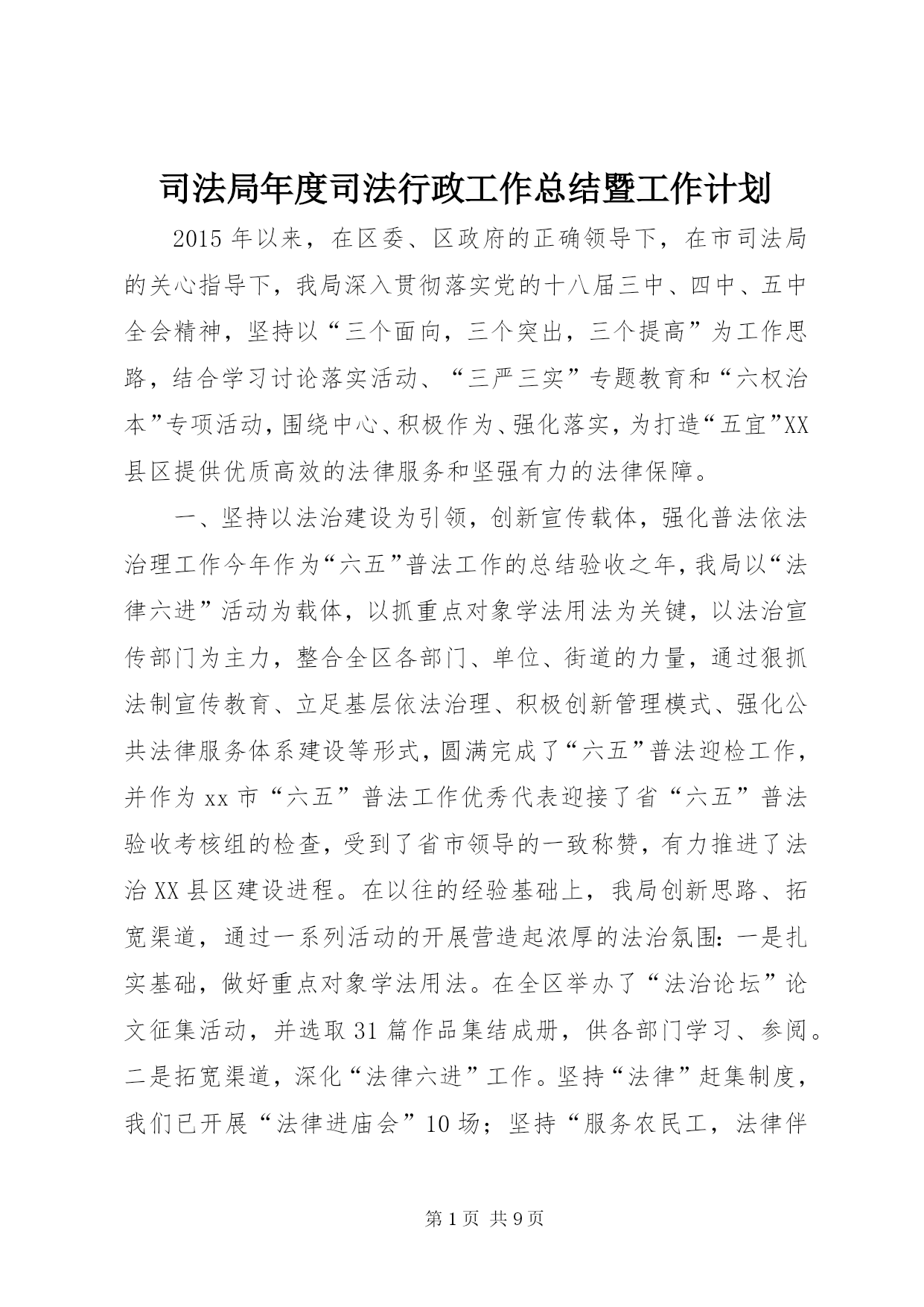 第PAGE\*Arabic\*MERGEFORMAT9页共NUMPAGES\*MERGEFORMAT9页司法局年度司法行政工作总结暨工作计划2015年以来,在区委、区政府的正确领导下,在市司法局的关心指导下,我局深入贯彻落实党的十八届三中、四中、五中全会精神,坚持以“三个面向,三个突出,三个提高”为工作思路,结合学习讨论落实活动、“三严三实”专题教育和“六权治本”专项活动,围绕中心、积极作为、强化落实,为打造“五宜”XX县区提供优质高效的法律服务和坚强有力的法律保障。一、坚持以法治建设为引领,