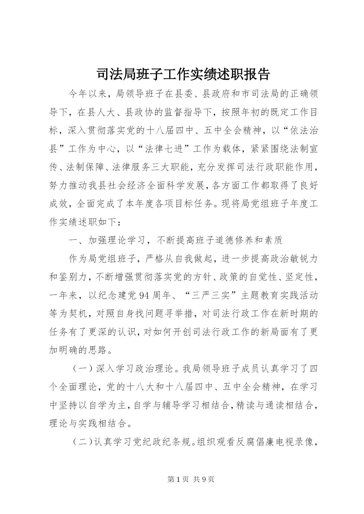 第PAGE\*Arabic\*MERGEFORMAT9页共NUMPAGES\*MERGEFORMAT9页司法局班子工作实绩述职报告今年以来,局领导班子在县委、县政府和市司法局的正确领导下,在县人大、县政协的监督指导下,按照年初的既定工作目标,深入贯彻落实党的十八届四中、五中全会精神,以“依法治县”工作为中心,以“法律七进”工作为载体,紧紧围绕法制宣传、法制保障、法律服务三大职能,充分发挥司法行政职能作用,努力推动我县社会经济全面科学发展,各方面工作都取得了良好成效,全面完成了本年度各项目标任务