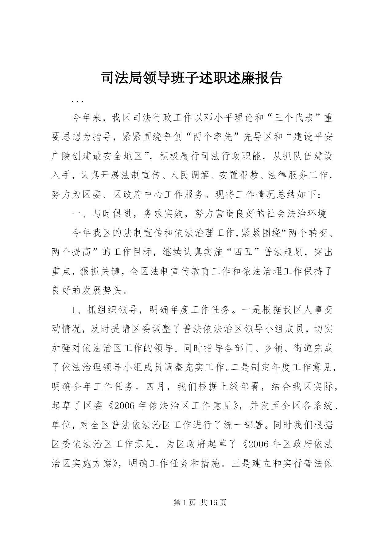 第PAGE\*Arabic\*MERGEFORMAT16页共NUMPAGES\*MERGEFORMAT16页司法局领导班子述职述廉报告...今年来,我区司法行政工作以邓小平理论和“三个代表”重要思想为指导,紧紧围绕争创“两个率先”先导区和“建设平安广陵创建最安全地区”,积极履行司法行政职能,从抓队伍建设入手,认真开展法制宣传、人民调解、安置帮教、法律服务工作,努力为区委、区政府中心工作服务。现将工作情况总结如下:一、与时俱进,务求实效,努力营造良好的社会法治环境今年我区的法制宣传和依法治理工作