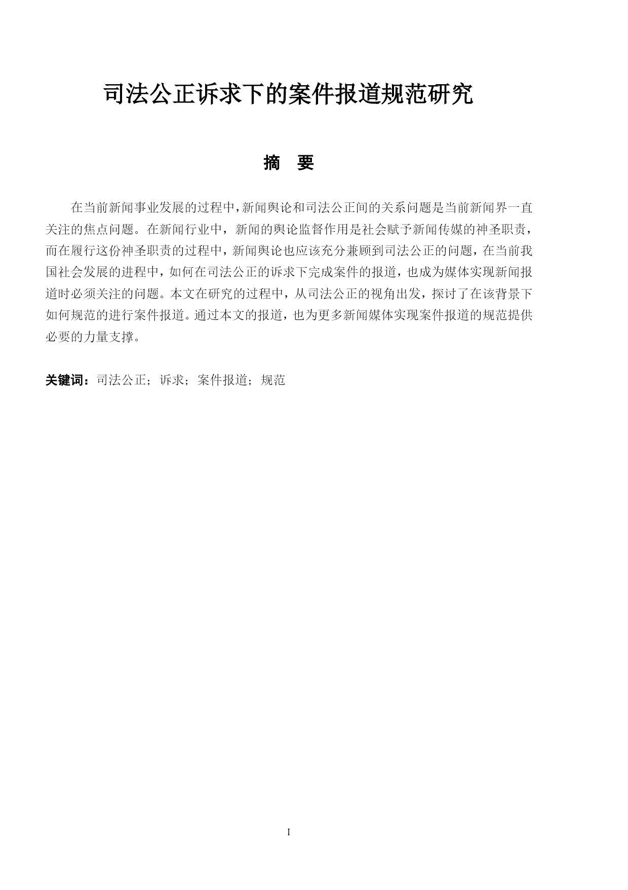 PAGEPAGE15司法公正诉求下的案件报道规范研究摘要在当前新闻事业发展的过程中,新闻舆论和司法公正间的关系问题是当前新闻界一直关注的焦点问题。在新闻行业中,新闻的舆论监督作用是社会赋予新闻传媒的神圣职责,而在履行这份神圣职责的过程中,新闻舆论也应该充分兼顾到司法公正的问题,在当前我国社会发展的进程中,如何在司法公正的诉求下完成案件的报道,也成为媒体实现新闻报道时必须关注的问题。本文在研究的过程中,从司法公正的视角出发,探讨了在该背景下如何规范的进行案件报道。通过本文的报道,也为更多新闻媒体