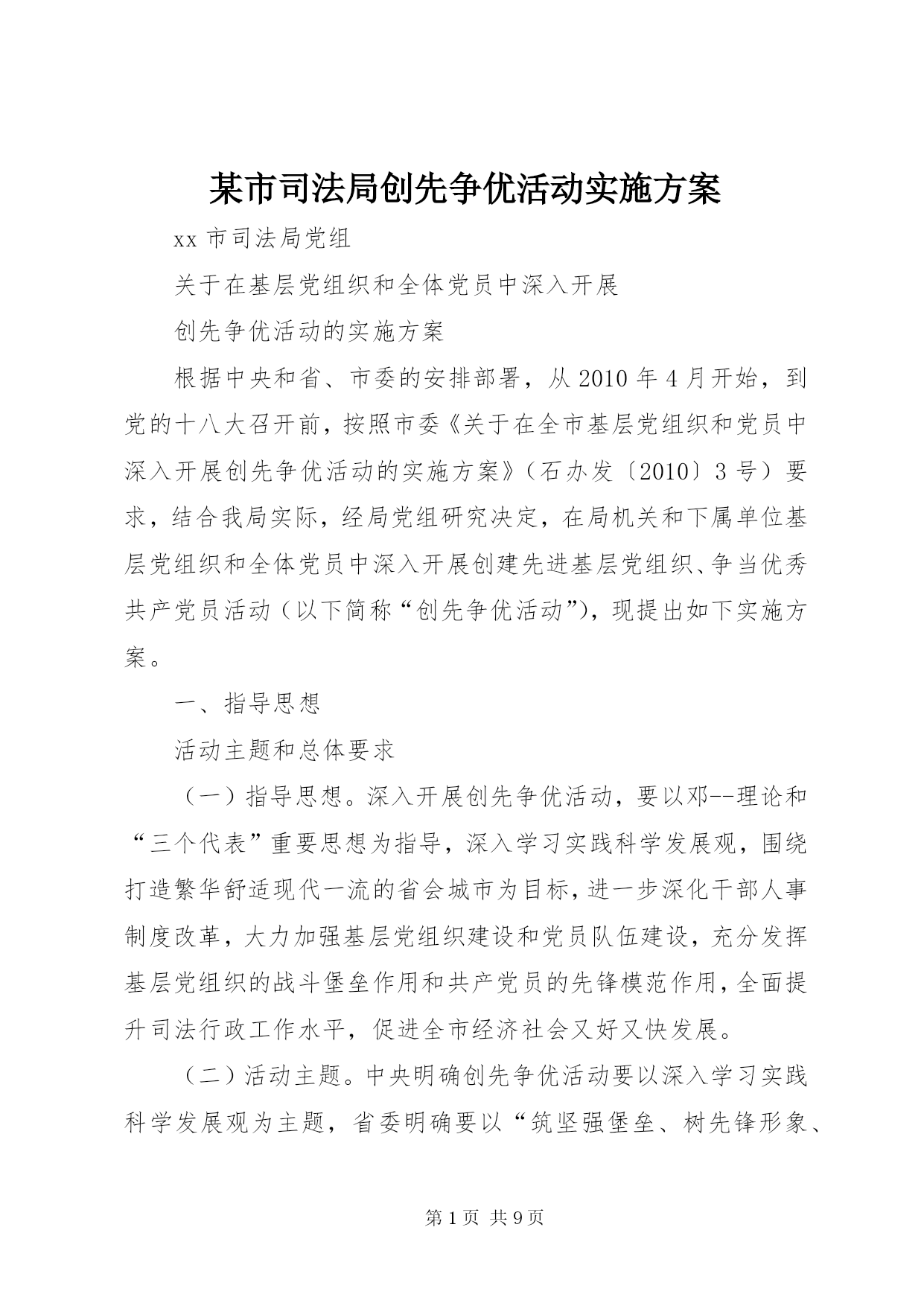 第PAGE\*Arabic\*MERGEFORMAT9页共NUMPAGES\*MERGEFORMAT9页某市司法局创先争优活动实施方案xx市司法局党组关于在基层党组织和全体党员中深入开展创先争优活动的实施方案根据中央和省、市委的安排部署,从2010年4月开始,到党的十八大召开前,按照市委《关于在全市基层党组织和党员中深入开展创先争优活动的实施方案》(石办发〔2010〕3号)要求,结合我局实际,经局党组研究决定,在局机关和下属单位基层党组织和全体党员中深入开展创建先进基层党组织、争当优秀共产党员