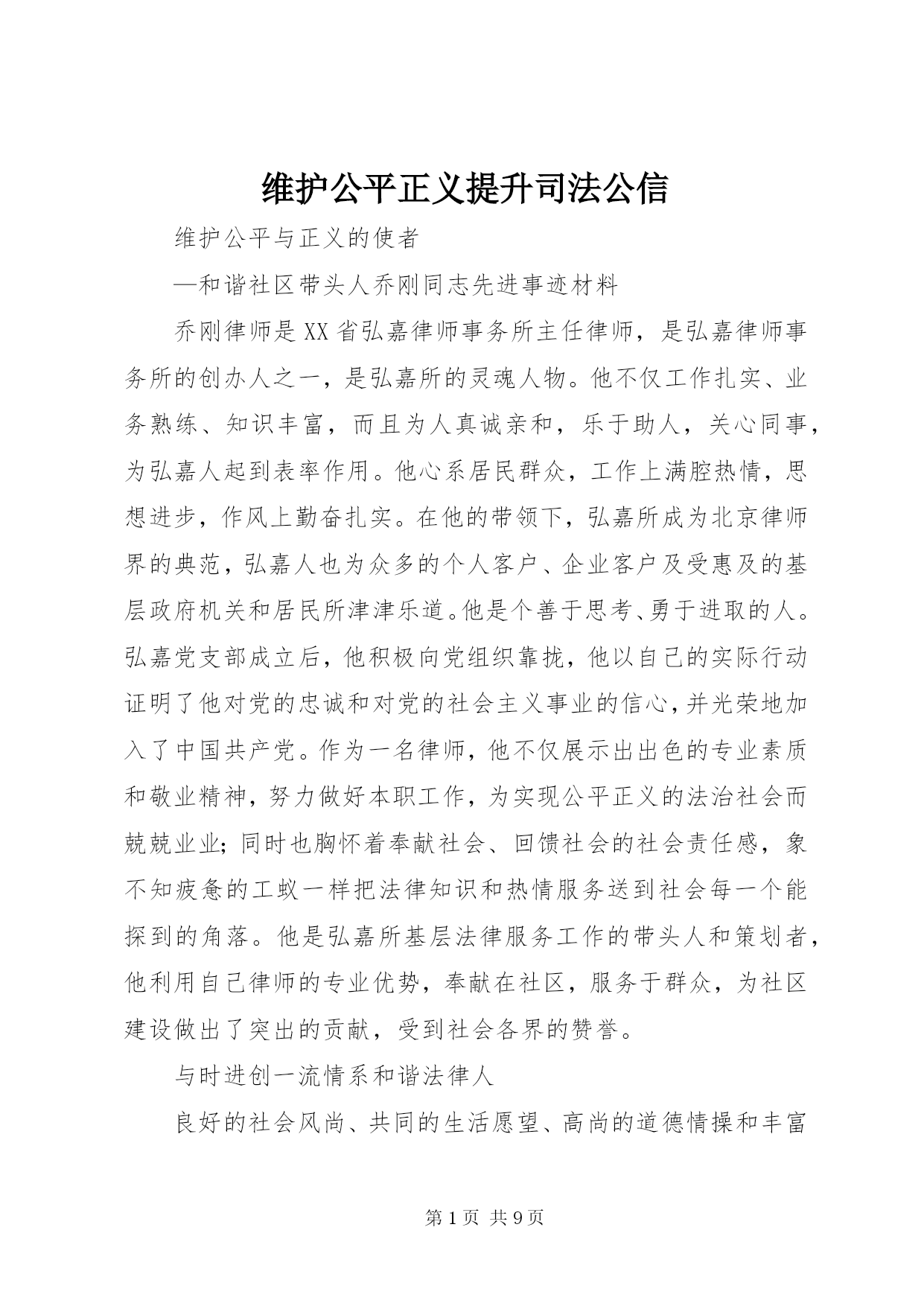 第PAGE\*Arabic\*MERGEFORMAT9页共NUMPAGES\*MERGEFORMAT9页维护公平正义提升司法公信维护公平与正义的使者—和谐社区带头人乔刚同志先进事迹材料乔刚律师是XX省弘嘉律师事务所主任律师,是弘嘉律师事务所的创办人之一,是弘嘉所的灵魂人物。他不仅工作扎实、业务熟练、知识丰富,而且为人真诚亲和,乐于助人,关心同事,为弘嘉人起到表率作用。他心系居民群众,工作上满腔热情,思想进步,作风上勤奋扎实。在他的带领下,弘嘉所成为北京律师界的典范,弘嘉人也为众多的个人客户、企