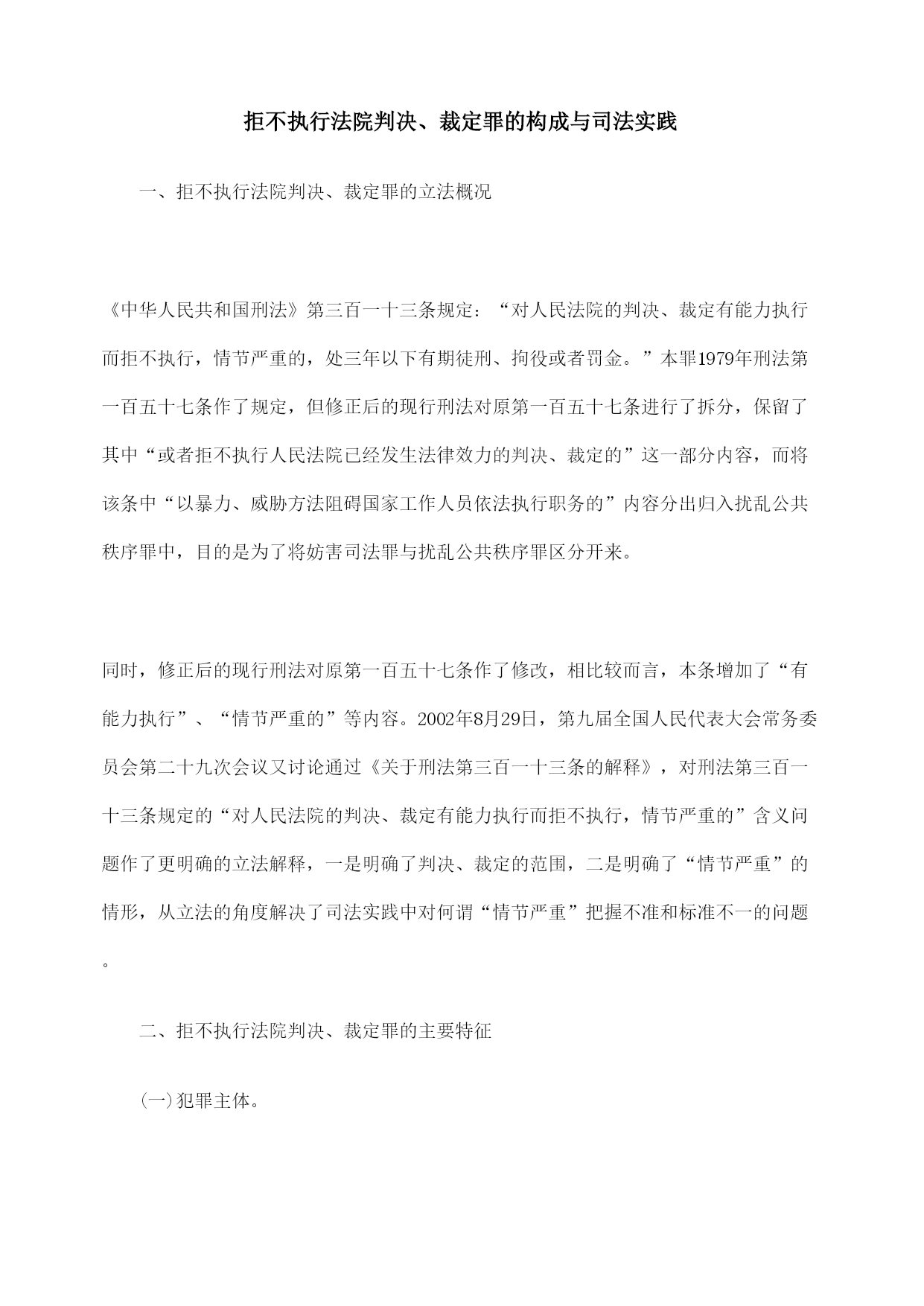 拒不执行法院判决、裁定罪的构成与司法实践一、拒不执行法院判决、裁定罪的立法概况《中华人民共和国刑法》第三百一十三条规定:“对人民法院的判决、裁定有能力执行而拒不执行,情节严重的,处三年以下有期徒刑、拘役或者罚金。”本罪1979年刑法第一百五十七条作了规定,但修正后的现行刑法对原第一百五十七条进行了拆分,保留了其中“或者拒不执行人民法院已经发生法律效力的判决、裁定的”这一部分内容,而将该条中“以暴力、威胁方法阻碍国家工作人员依法执行职务的”内容分出归入扰乱公共秩序罪中,目的是为了将妨害司法罪与扰乱公共秩序罪