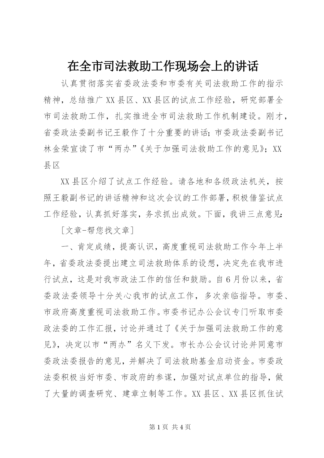 第PAGE\*Arabic\*MERGEFORMAT4页共NUMPAGES\*MERGEFORMAT4页在全市司法救助工作现场会上的讲话认真贯彻落实省委政法委和市委有关司法救助工作的指示精神,总结推广XX县区、XX县区的试点工作经验,研究部署全市司法救助工作,扎实推进全市司法救助工作机制建设。刚才,省委政法委副书记王毅作了十分重要的讲话;市委政法委副书记林金荣宣读了市“两办”《关于加强司法救助工作的意见》;XX县区XX县区介绍了试点工作经验。请各地和各级政法机关,按照王毅副书记的讲话精神和这次