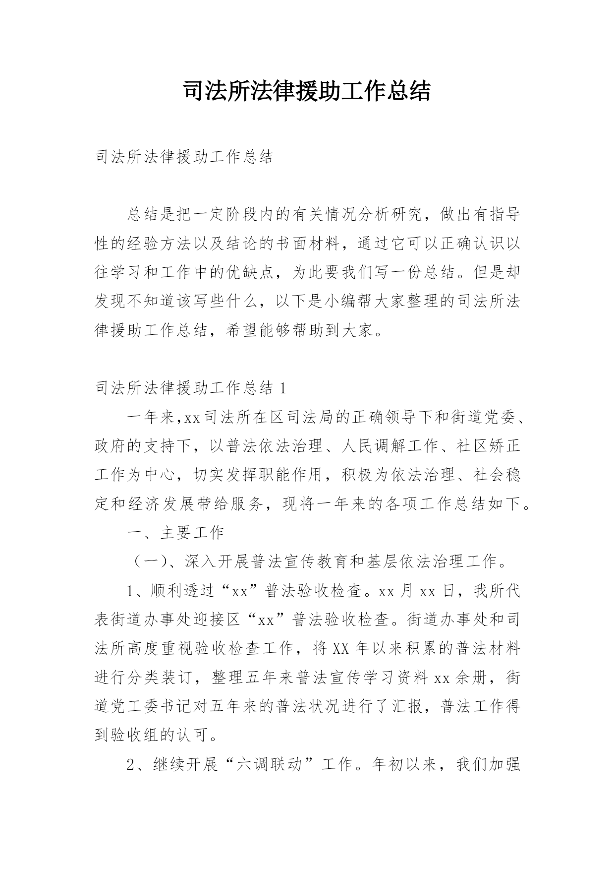 司法所法律援助工作总结司法所法律援助工作总结总结是把一定阶段内的有关情况分析研究,做出有指导性的经验方法以及结论的书面材料,通过它可以正确认识以往学习和工作中的优缺点,为此要我们写一份总结。但是却发现不知道该写些什么,以下是小编帮大家整理的司法所法律援助工作总结,希望能够帮助到大家。司法所法律援助工作总结1一年来,xx司法所在区司法局的正确领导下和街道党委、政府的支持下,以普法依法治理、人民调解工作、社区矫正工作为中心,切实发挥职能作用,积极为依法治理、社会稳定和经济发展带给服务,现将一年来的各项工作总结