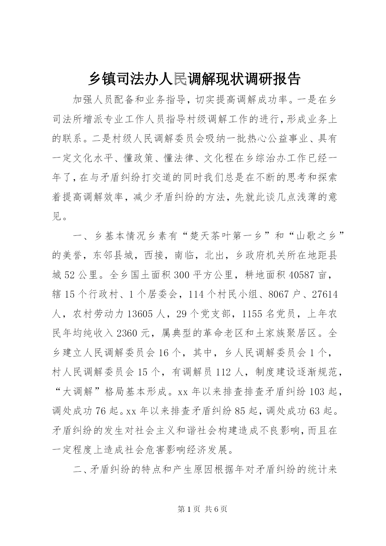 第PAGE\*Arabic\*MERGEFORMAT6页共NUMPAGES\*MERGEFORMAT6页乡镇司法办人民调解现状调研报告加强人员配备和业务指导,切实提高调解成功率。一是在乡司法所增派专业工作人员指导村级调解工作的进行,形成业务上的联系。二是村级人民调解委员会吸纳一批热心公益事业、具有一定文化水平、懂政策、懂法律、文化程在乡综治办工作已经一年了,在与矛盾纠纷打交道的同时我们总是在不断的思考和探索着提高调解效率,减少矛盾纠纷的方法,先就此谈几点浅薄的意见。一、乡基本情况乡素有“楚天茶