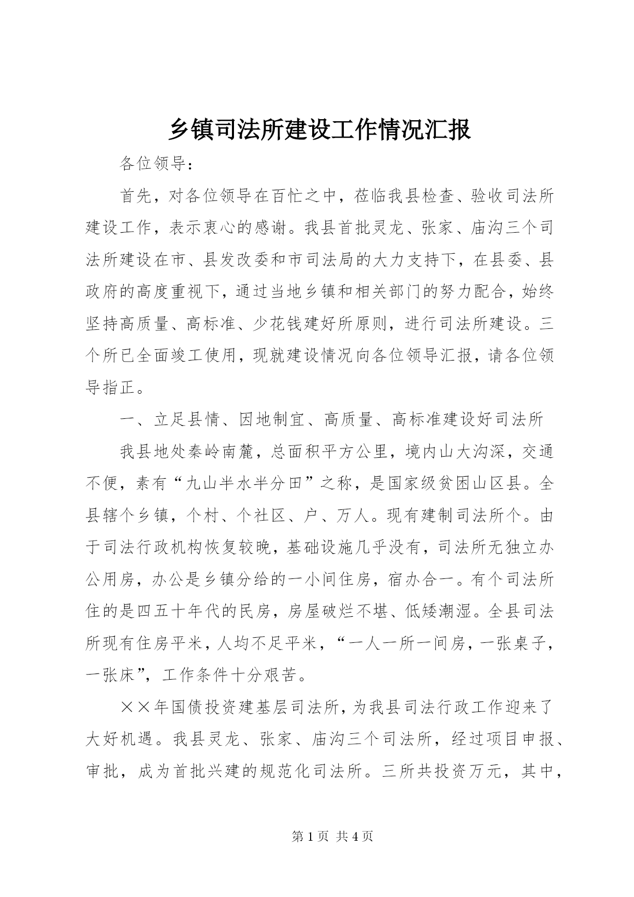 第PAGE\*Arabic\*MERGEFORMAT4页共NUMPAGES\*MERGEFORMAT4页乡镇司法所建设工作情况汇报各位领导:首先,对各位领导在百忙之中,莅临我县检查、验收司法所建设工作,表示衷心的感谢。我县首批灵龙、张家、庙沟三个司法所建设在市、县发改委和市司法局的大力支持下,在县委、县政府的高度重视下,通过当地乡镇和相关部门的努力配合,始终坚持高质量、高标准、少花钱建好所原则,进行司法所建设。三个所已全面竣工使用,现就建设情况向各位领导汇报,请各位领导指正。一、立足县情、因地