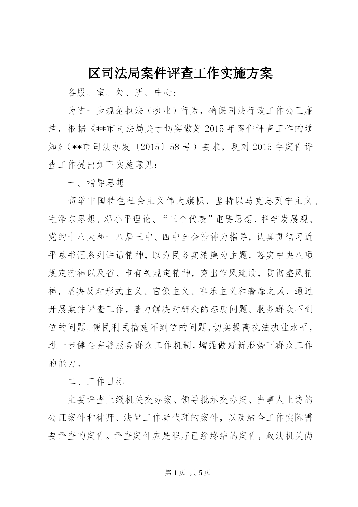 第PAGE\*Arabic\*MERGEFORMAT5页共NUMPAGES\*MERGEFORMAT5页区司法局案件评查工作实施方案各股、室、处、所、中心:为进一步规范执法(执业)行为,确保司法行政工作公正廉洁,根据《**市司法局关于切实做好2015年案件评查工作的通知》(**市司法办发〔2015〕58号)要求,现对2015年案件评查工作提出如下实施意见:一、指导思想高举中国特色社会主义伟大旗帜,坚持以马克思列宁主义、毛泽东思想、邓小平理论、“三个代表”重要思想、科学发展观、党的十八大和十八届