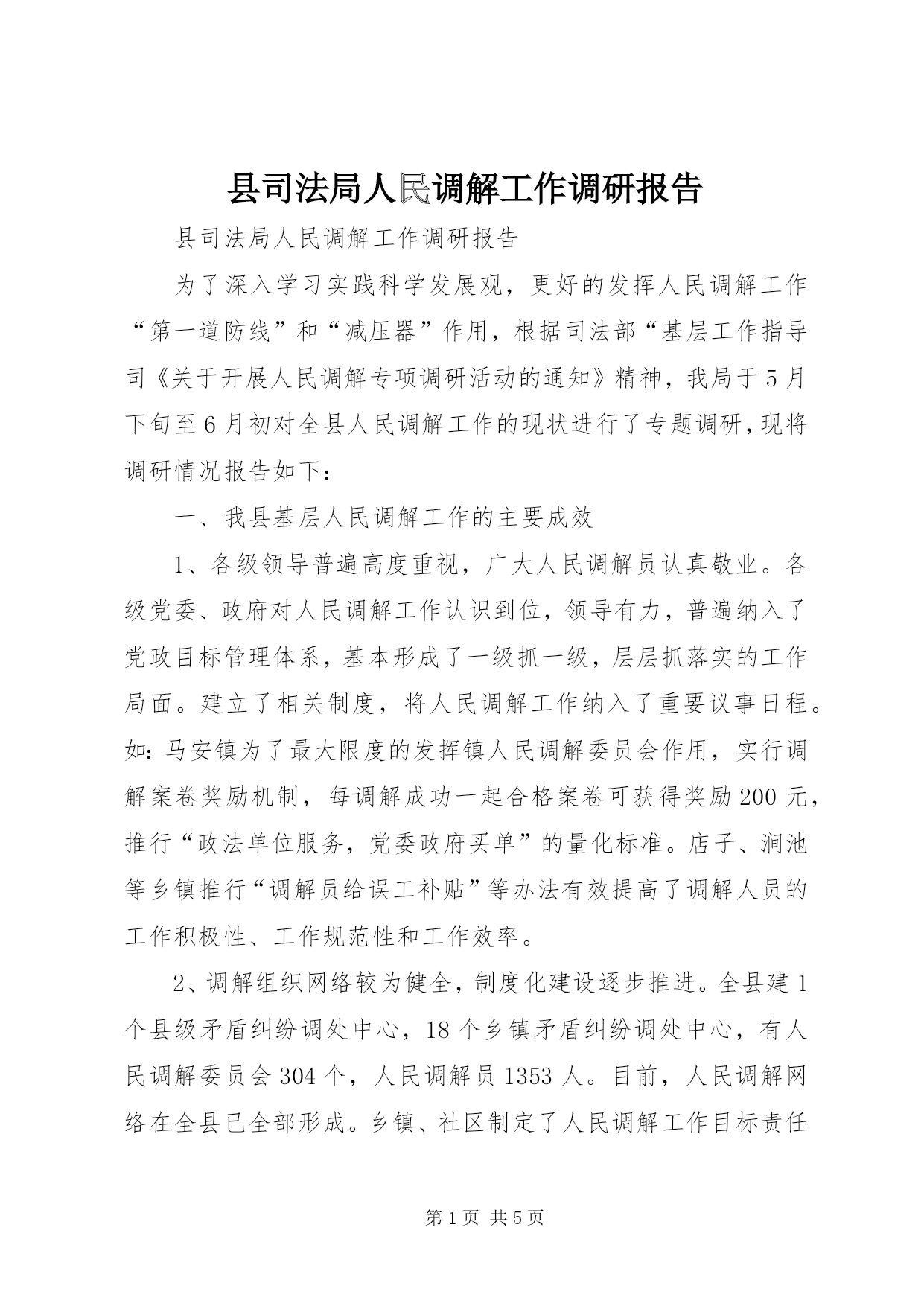第PAGE\*Arabic\*MERGEFORMAT5页共NUMPAGES\*MERGEFORMAT5页县司法局人民调解工作调研报告县司法局人民调解工作调研报告为了深入学习实践科学发展观,更好的发挥人民调解工作“第一道防线”和“减压器”作用,根据司法部“基层工作指导司《关于开展人民调解专项调研活动的通知》精神,我局于5月下旬至6月初对全县人民调解工作的现状进行了专题调研,现将调研情况报告如下:一、我县基层人民调解工作的主要成效1、各级领导普遍高度重视,广大人民调解员认真敬业。各级党委、政府对人
