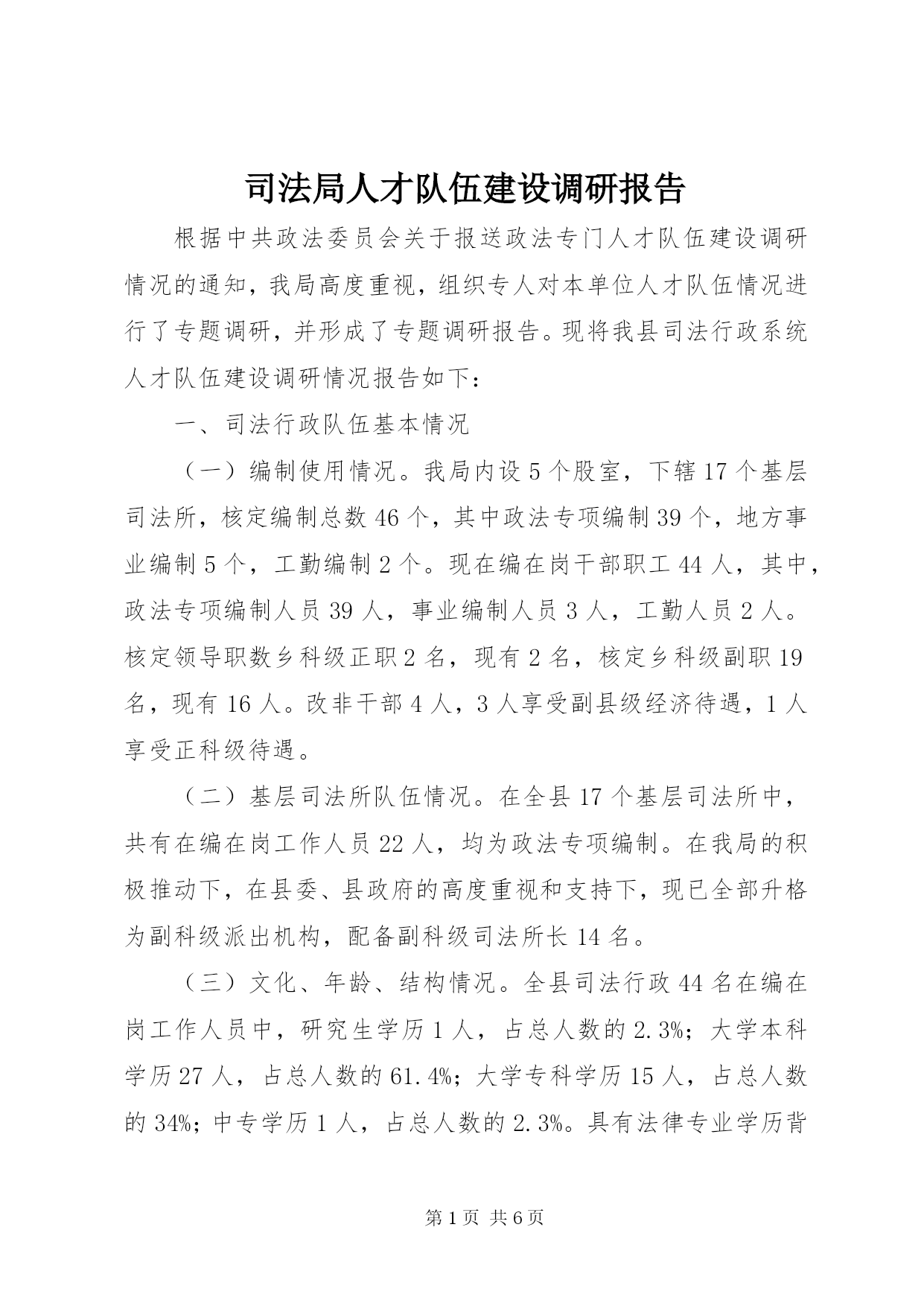 第PAGE\*Arabic\*MERGEFORMAT6页共NUMPAGES\*MERGEFORMAT6页司法局人才队伍建设调研报告根据中共政法委员会关于报送政法专门人才队伍建设调研情况的通知,我局高度重视,组织专人对本单位人才队伍情况进行了专题调研,并形成了专题调研报告。现将我县司法行政系统人才队伍建设调研情况报告如下:一、司法行政队伍基本情况(一)编制使用情况。我局内设5个股室,下辖17个基层司法所,核定编制总数46个,其中政法专项编制39个,地方事业编制5个,工勤编制2个。现在编在岗干部职