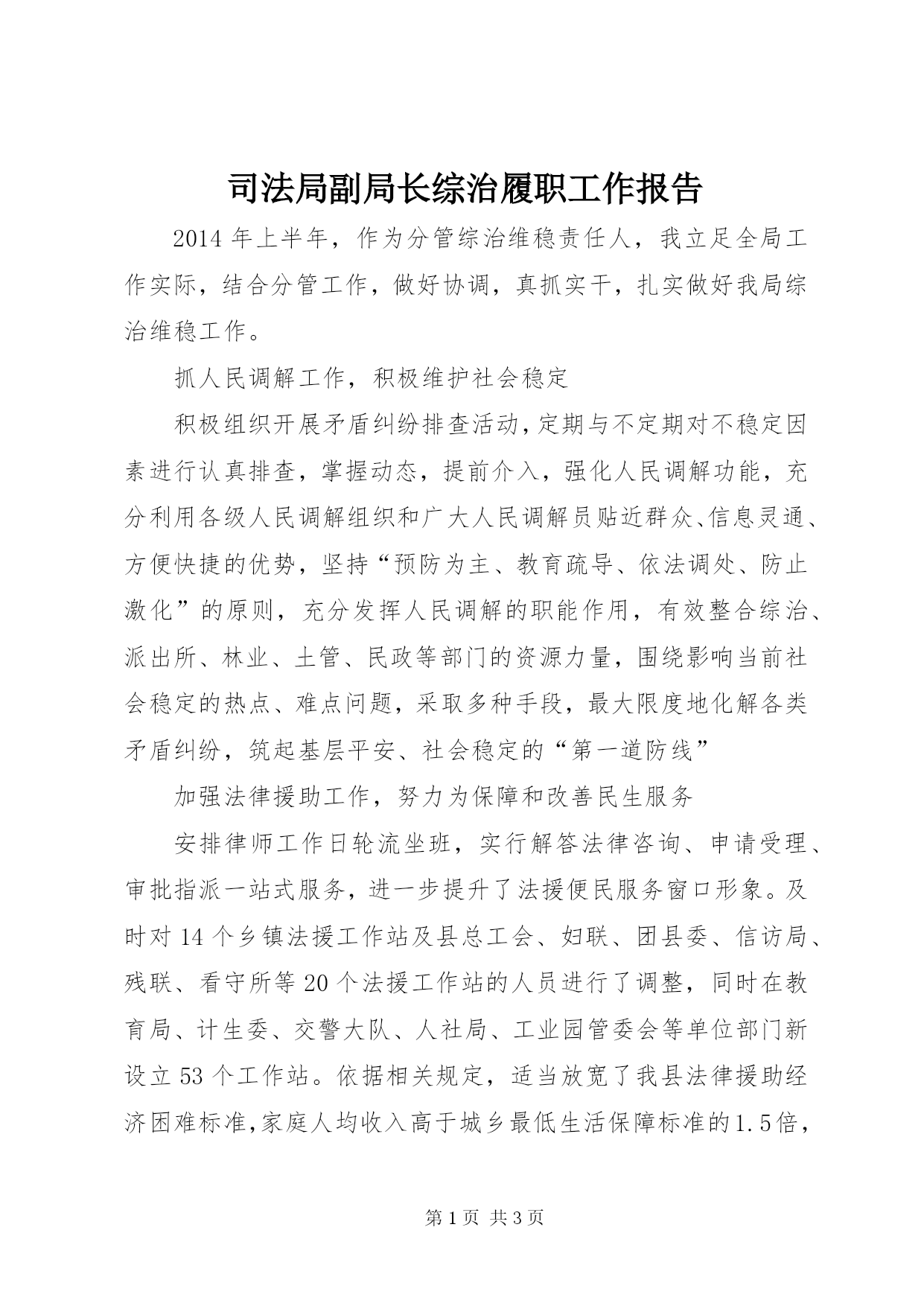 第PAGE\*Arabic\*MERGEFORMAT3页共NUMPAGES\*MERGEFORMAT3页司法局副局长综治履职工作报告2014年上半年,作为分管综治维稳责任人,我立足全局工作实际,结合分管工作,做好协调,真抓实干,扎实做好我局综治维稳工作。抓人民调解工作,积极维护社会稳定积极组织开展矛盾纠纷排查活动,定期与不定期对不稳定因素进行认真排查,掌握动态,提前介入,强化人民调解功能,充分利用各级人民调解组织和广大人民调解员贴近群众、信息灵通、方便快捷的优势,坚持“预防为主、教育疏导、依法